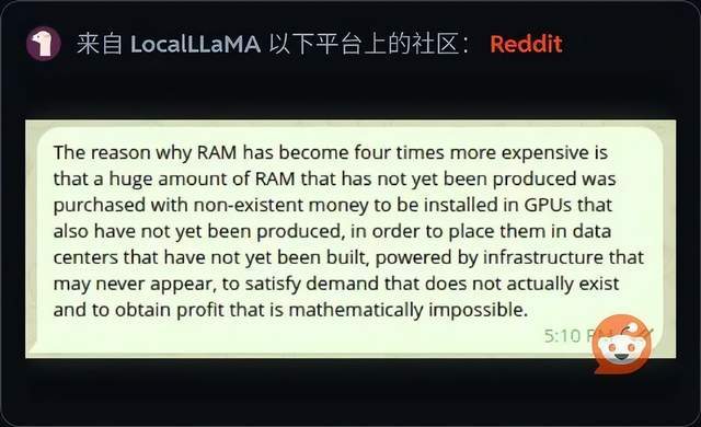 于是,关于内存泡沫的说法,在网上疯狂流传:内存价格之所以涨了四倍,是因为有人用根本不存在的钱,买下了大量尚未生产出来的内存,准备装进同样尚未生产出来的GPU里,再放进尚未建成的数据中心,依赖可能永远不会出现的基础设施供电,以满足实际并不存在的需求,从而获得数学上不可能实现的利润。