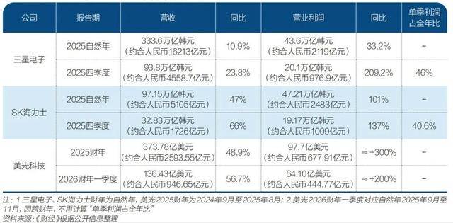 例如,三星2025年全年营收333.6万亿韩元、营业利润43.6万亿韩元、净利润45.2万亿韩元,同比分别增长10.9%、33.2%、31.2%。其四季度业绩表现尤为亮眼,营收93.8万亿韩元,营业利润20.1万亿韩元,同比增长209.2%,四季度营业利润占全年营业利润的46.0%。