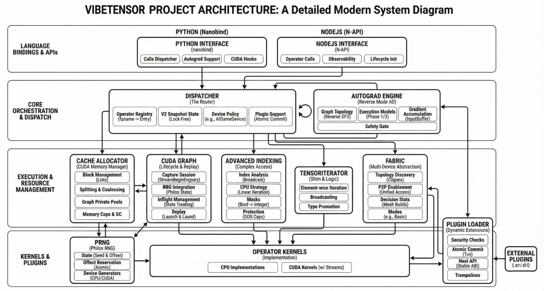 但在实现上,VibeTensor并不是PyTorch的封装或裁剪版,而是实现了自己的一整套系统栈。