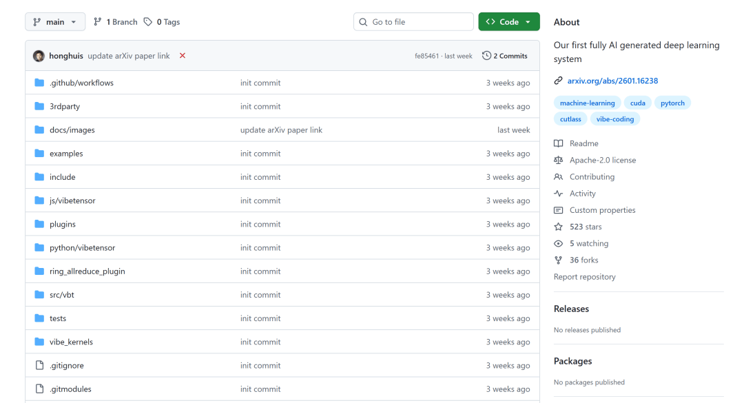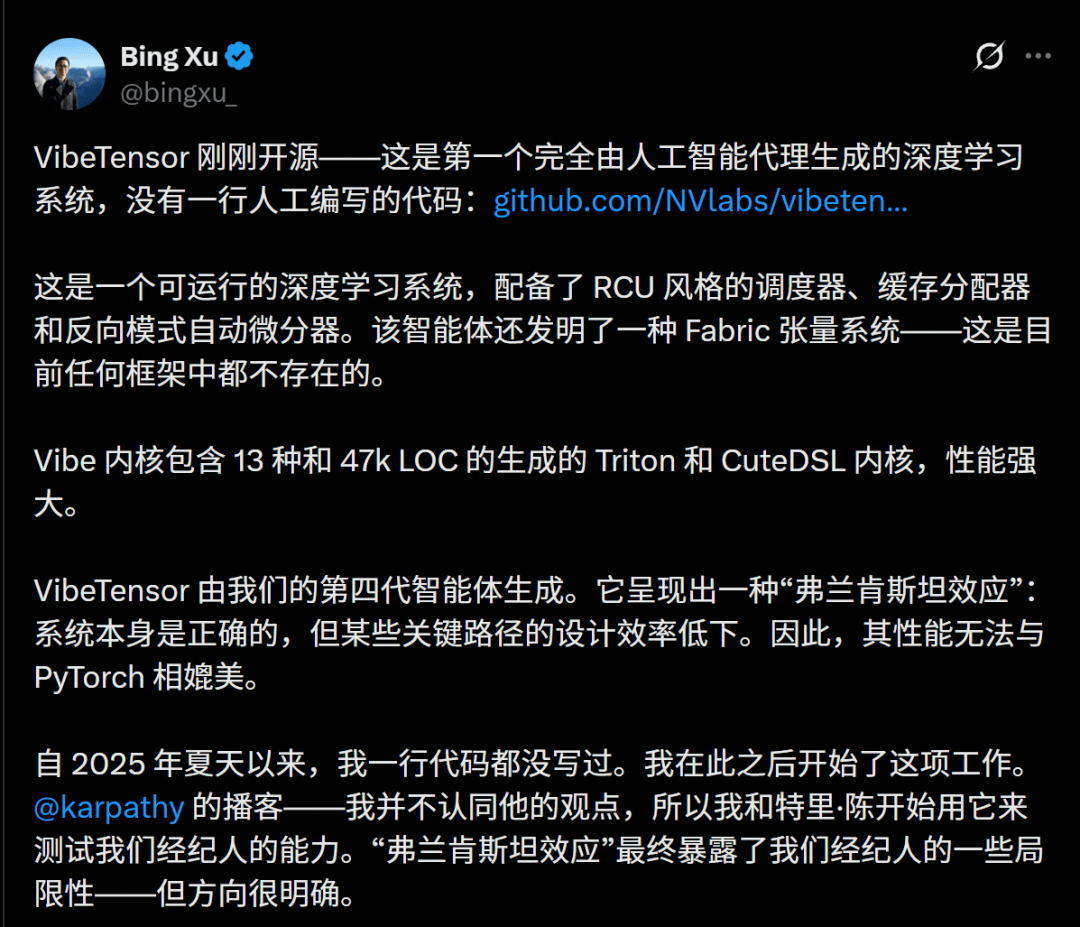英伟达高级工程师Bing Xu开源了VibeTensor项目,并且表示:「这是第一个完全由 AI智能体生成的深度学习系统,没有一行人类编写的代码。」