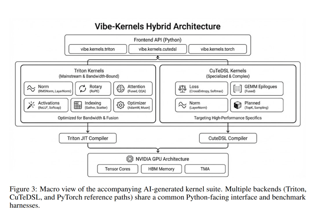 随论文一同发布的AI生成算子内核套件的宏观结构示意图,该套件包含多个后端实现(Triton、CuTeDSL以及PyTorch参考路径)