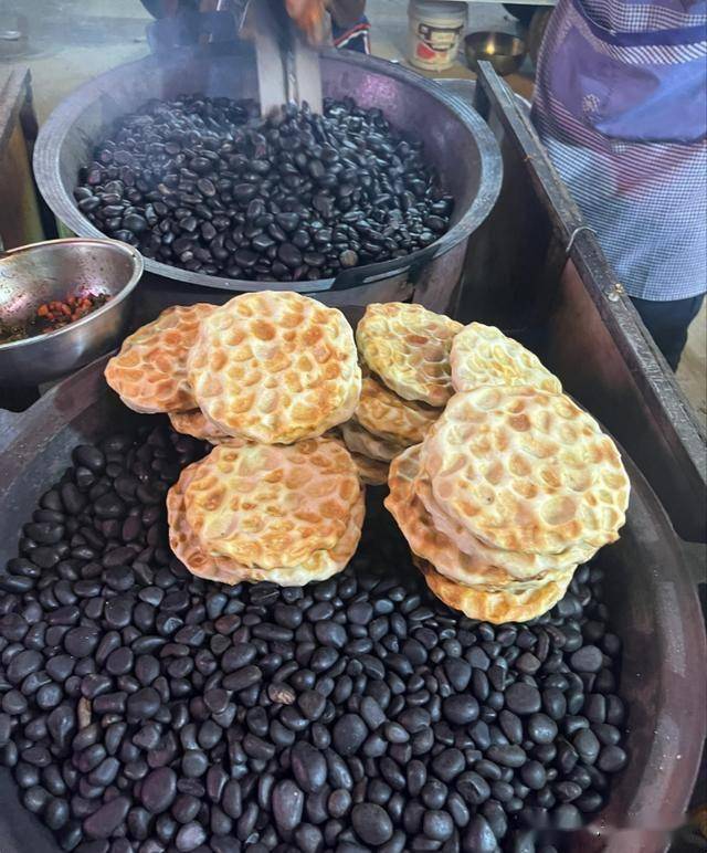 做法也很奇特,是把擀好的面饼放在烧热的鹅卵石上,再盖上另一层热石子烙熟。