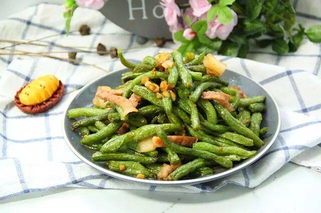 接着把炸过的四季豆放入锅内,和五花肉一起翻炒几下。