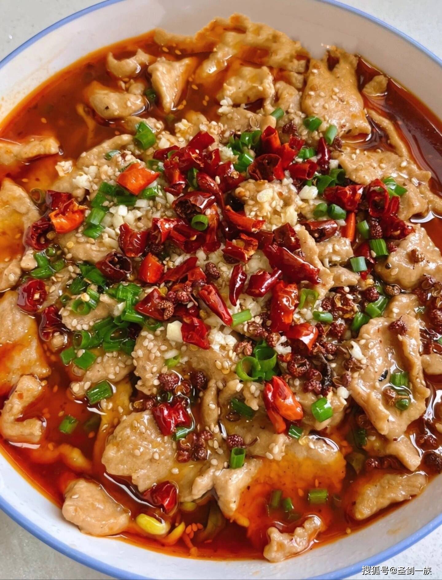 7. 在肉片表面放上大量干辣椒、花椒和剩下的蒜末,锅中烧一勺热油,烧至冒烟后,直接浇在辣椒和花椒上,麻辣香味瞬间激发,最后撒上葱花,麻辣鲜香,又香又过瘾,客人吃了都夸正宗。