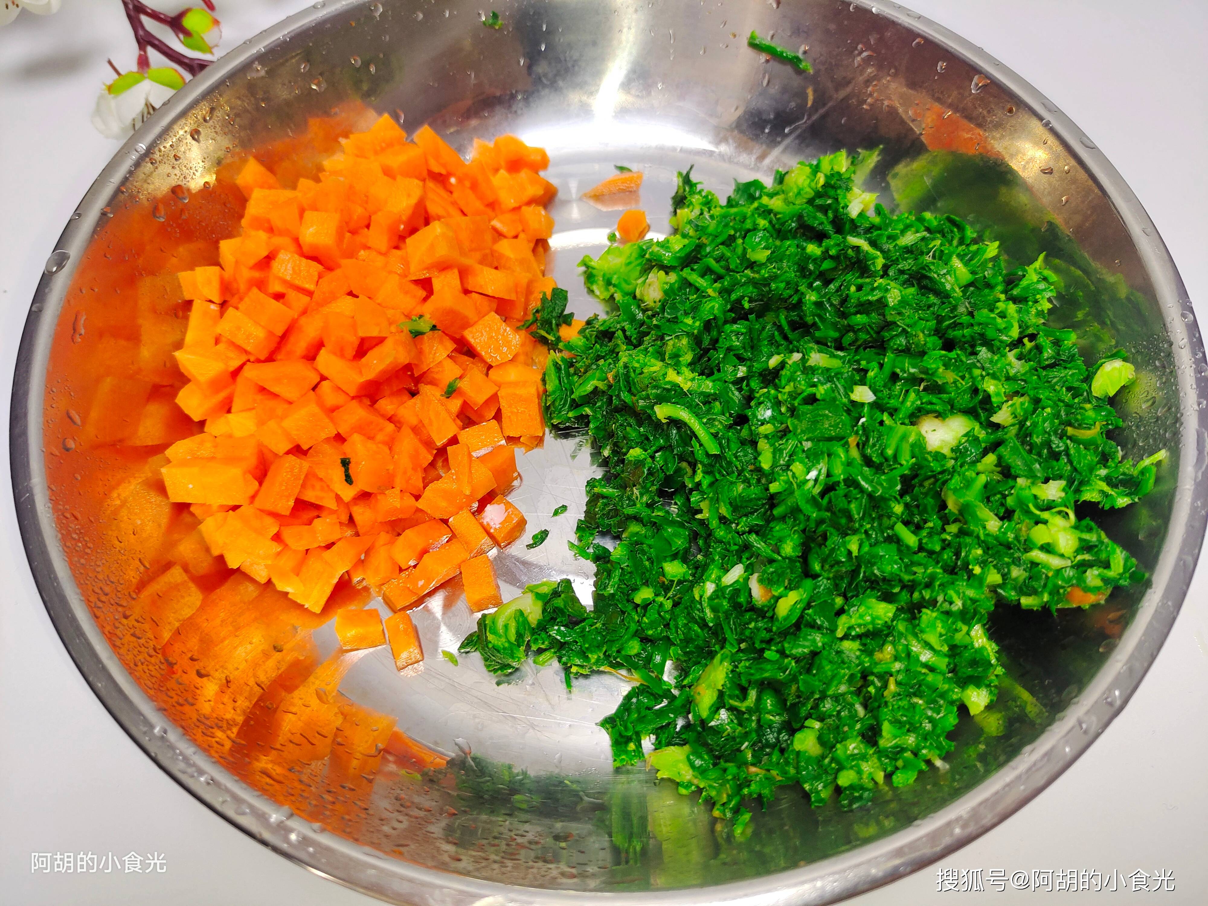 第二步:捞出的荠菜挤干水分,而后再将其切碎后放入盘子中备用。最好再搭配一些胡萝卜,将胡萝卜切成小粒即可。再准备两盒内酯豆腐,在塑料盒子底部拐角处剪开小口子,而后倒扣过来就可以轻松完整地取出豆腐块了,再将其切成小块放入碗中待用。