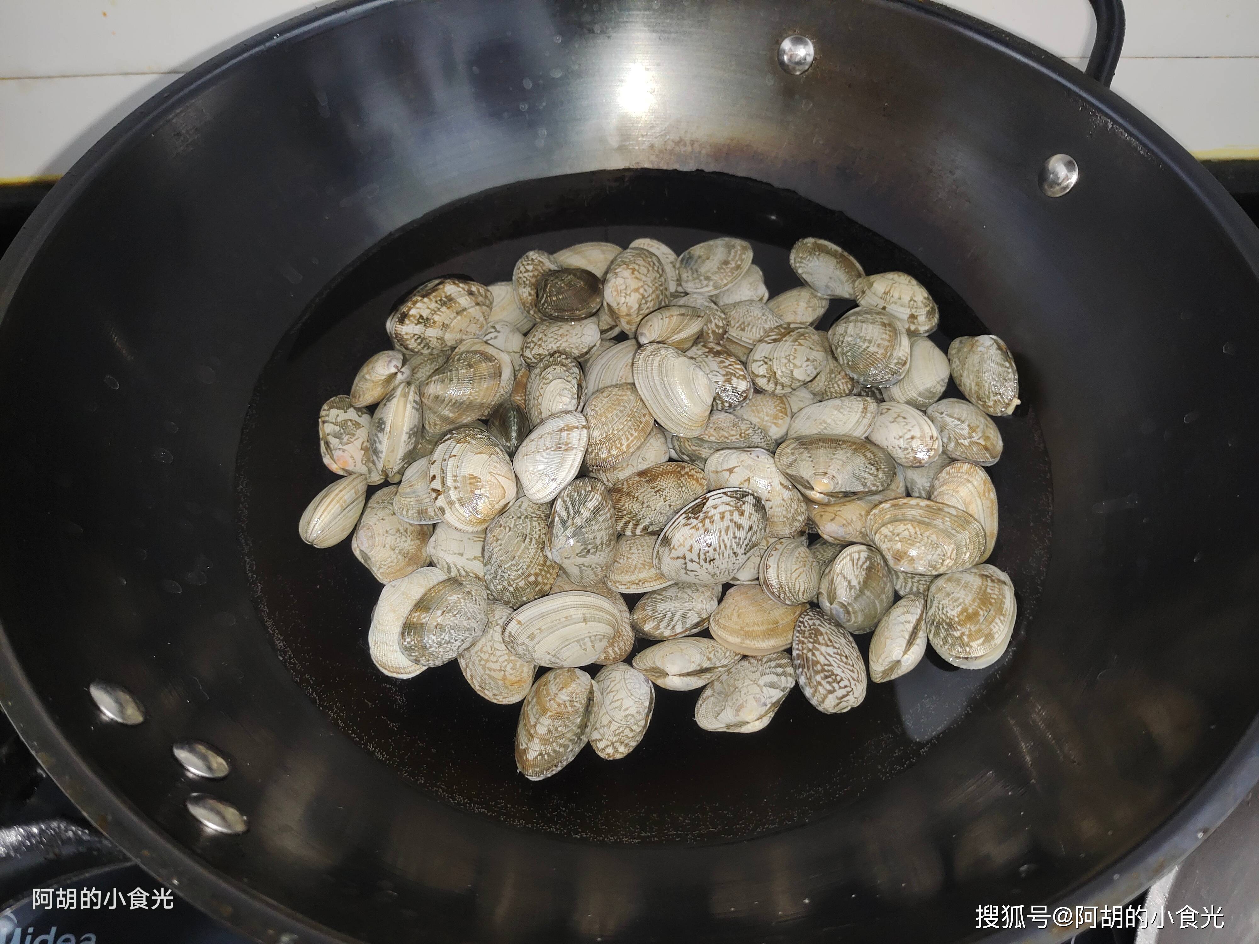 第三步:挑选一些鲜活的花蛤,用清水多多地淘洗干净,而后将其捞出放入锅中,再添入适量的清水大火煮开让其全部开壳,捞出后把花蛤肉全部剔出来备用。剩下的花蛤汤也不要浪费,倒出后置于一边沉淀一下备用。