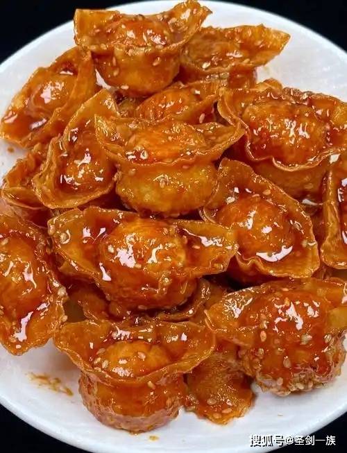 6. 锅留少许底油,倒入酱汁,小火煮至冒泡、略微浓稠。倒入炸好的元宝,快速翻炒均匀裹上酱汁,出锅撒上白芝麻即可。