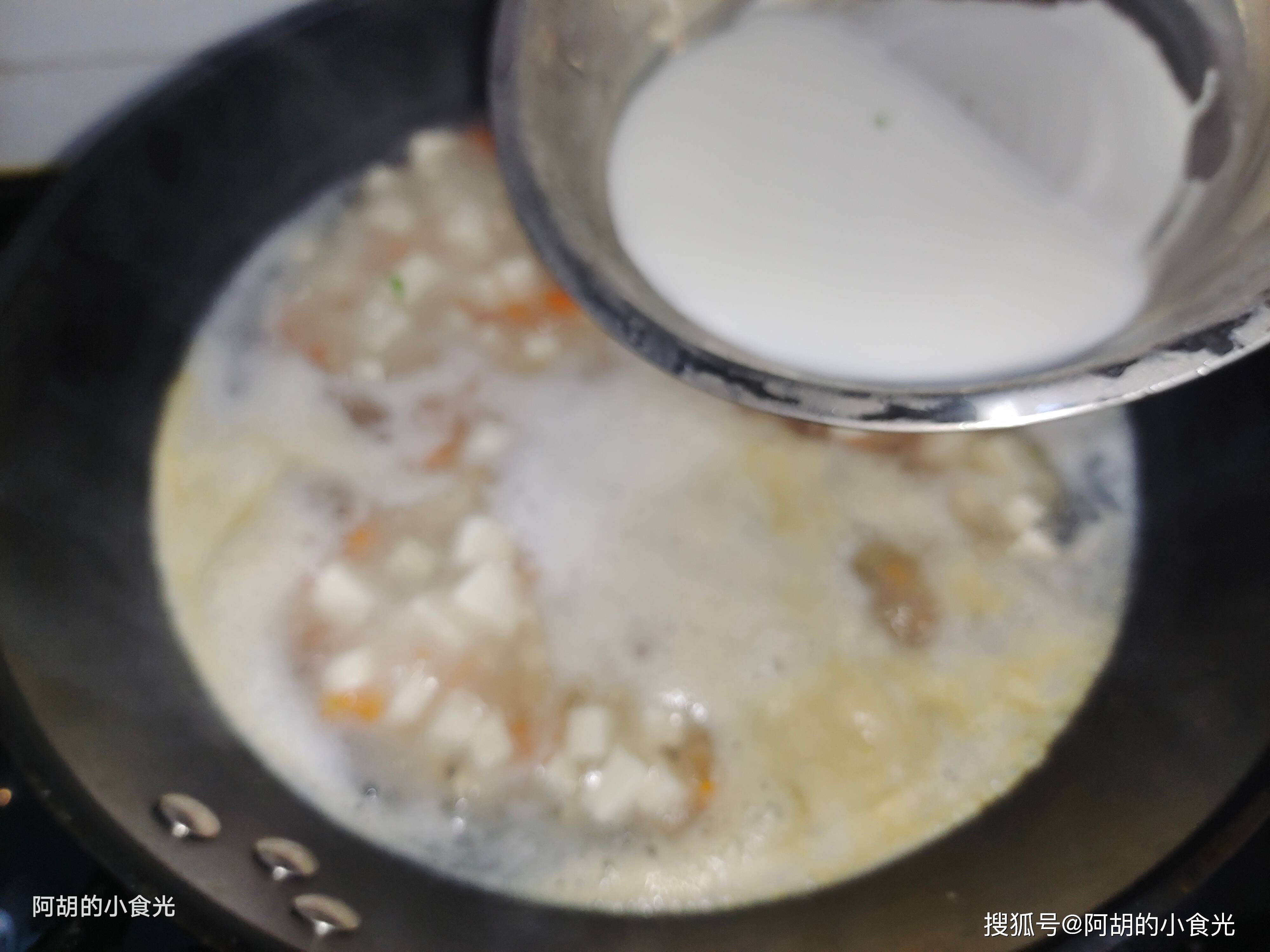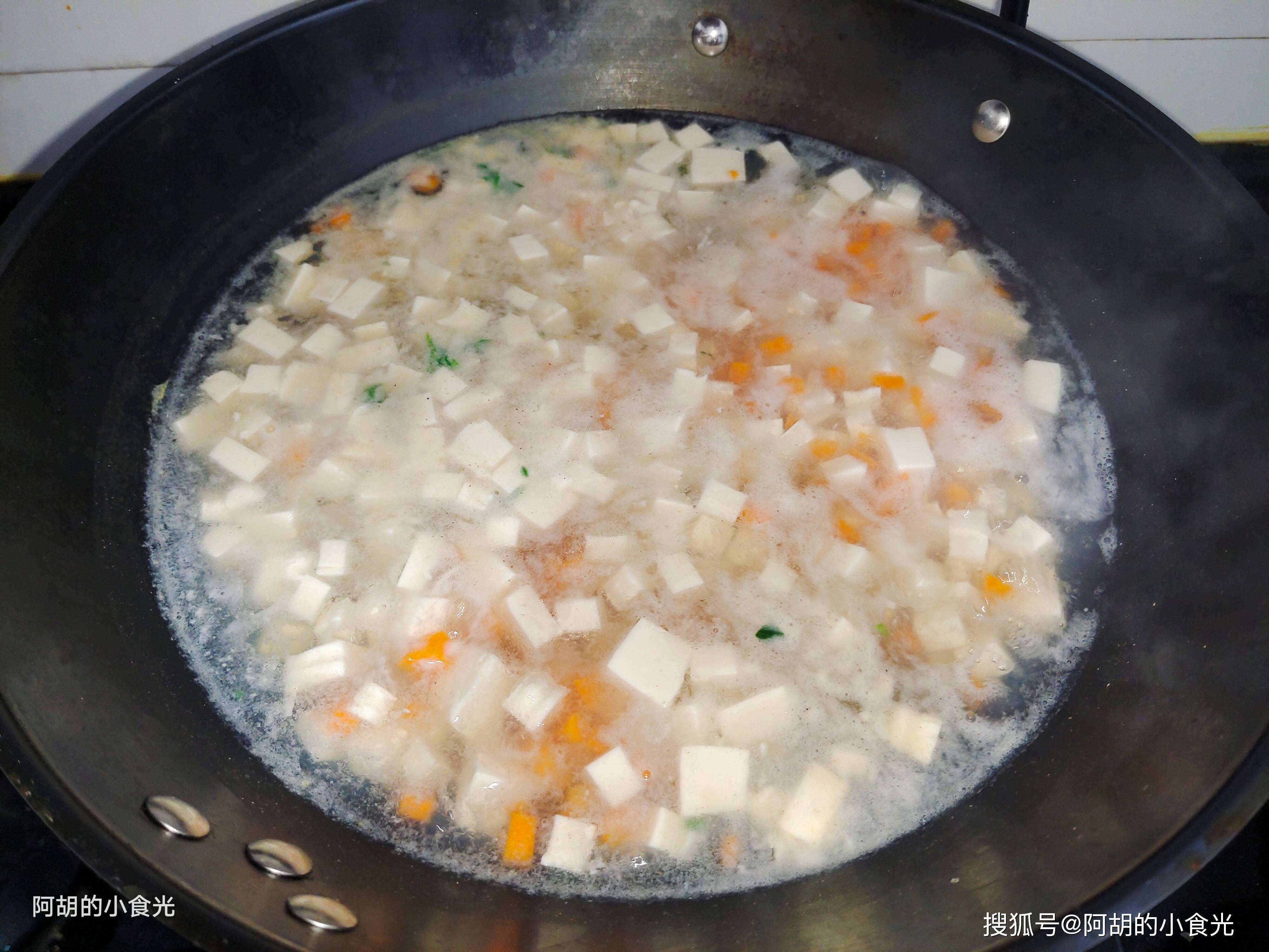 第四步:将上一步中沉淀好的花蛤汤重新回入锅中,用大火煮开,感觉水量不够的可以再添入适量的清水一块煮开,而后把嫩豆腐、胡萝卜丁一块倒入其中,保持大火煮个几分钟,注意过程中会有一些浮沫要打捞干净,而后调味就加入一些食盐和胡椒粉即可。