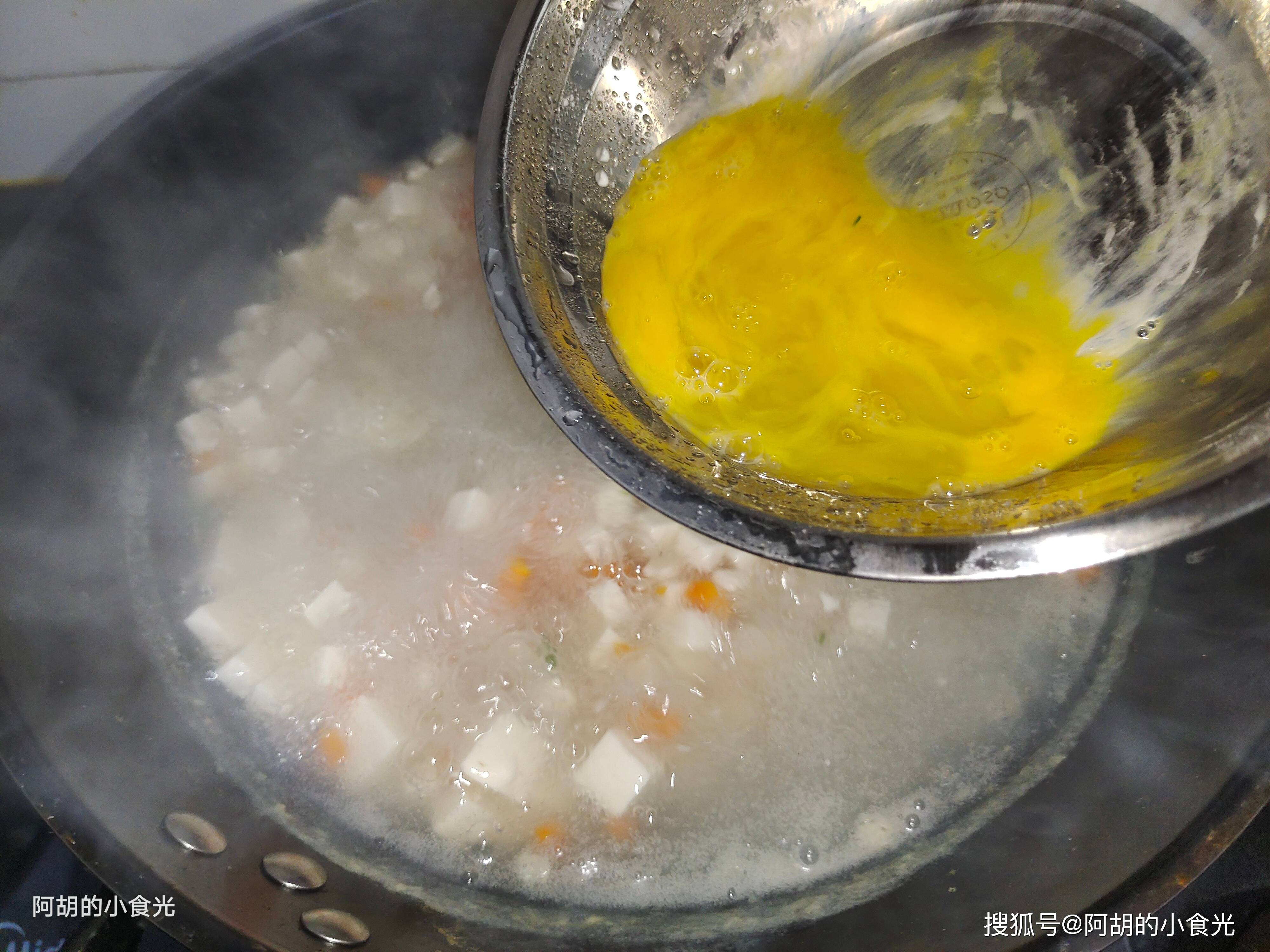 第五步:用凉水稀释一些生粉水,搅拌均匀后淋入锅内,同时保持锅内大火不停地搅动,让汤汁呈现一些浓稠的“米汤”状即可,再取两个鸡蛋打散后淋入锅内,搅拌一下让蛋液凝固成蛋花状。
