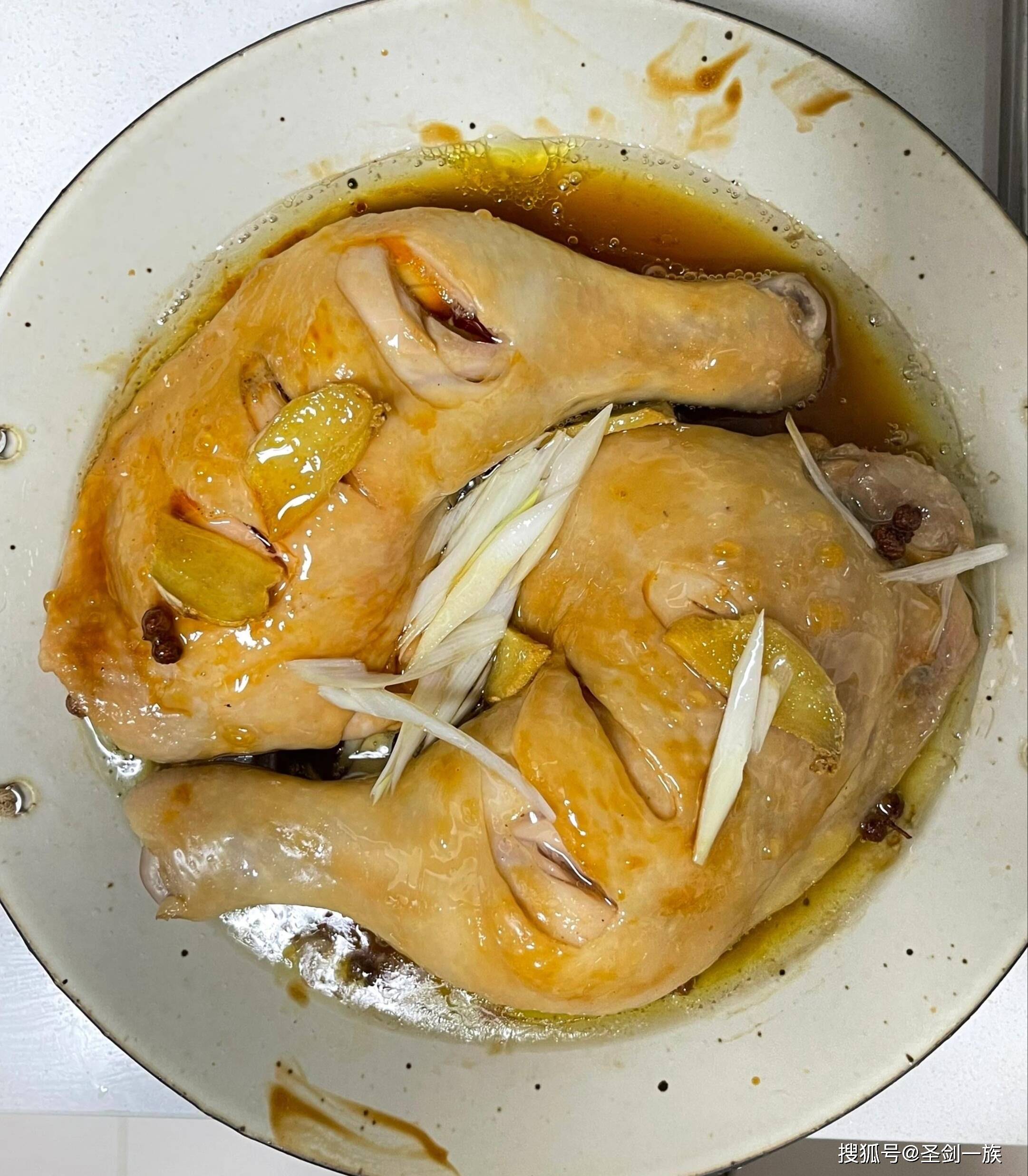 2、将处理好的鸡腿放入碗中,放入姜片、葱段,加入1勺料酒、1勺生抽、少许盐,抓拌均匀,腌制20分钟。