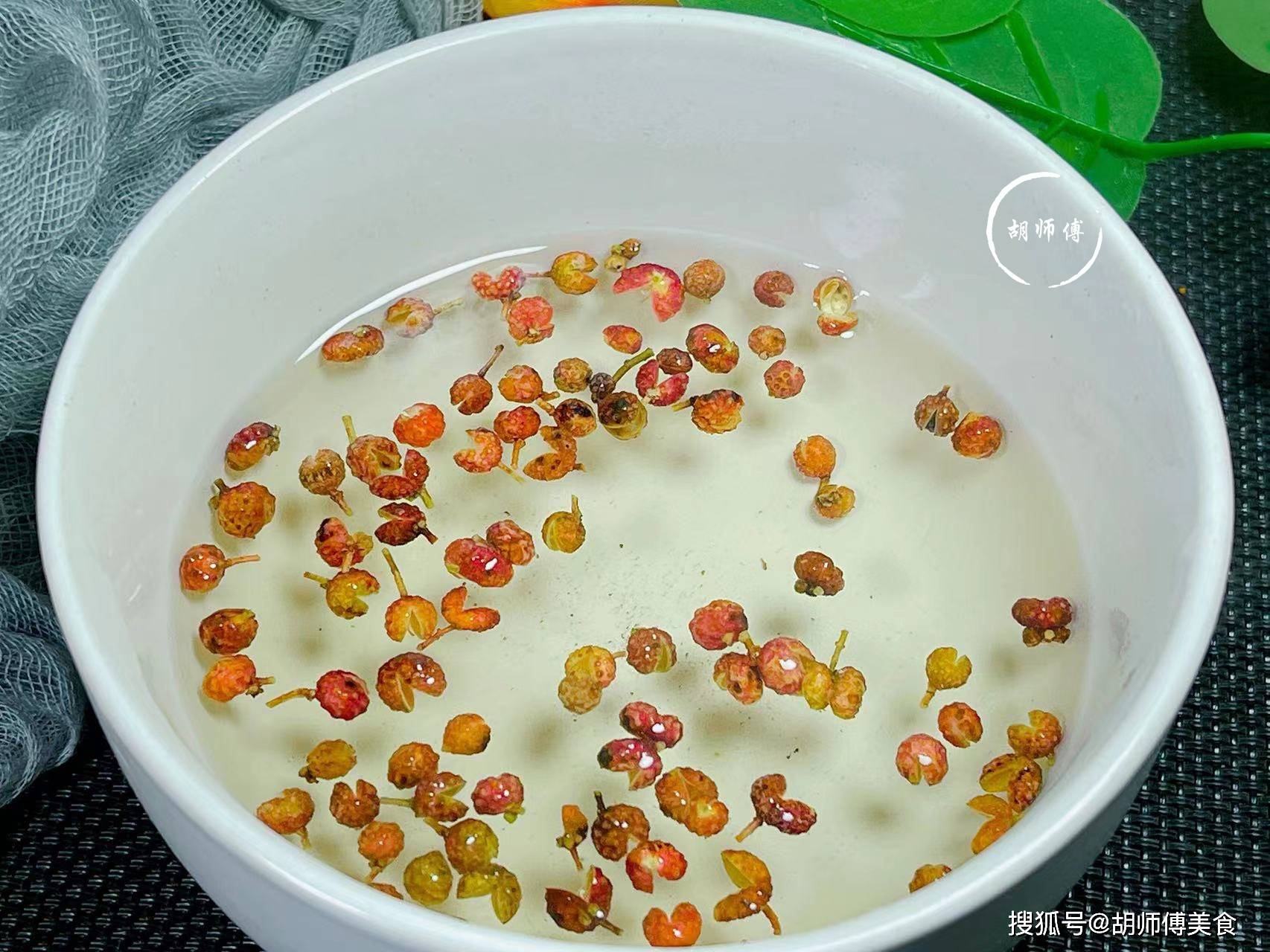 第三步:把花椒冲洗干净,然后把花椒和100ml热水放入碗中,将花椒浸泡10分钟,只留花椒水备用。