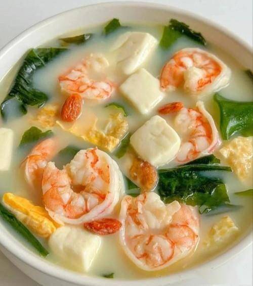 3. 加入豆腐、虾仁、鸡蛋碎,煮至虾仁变色,加调料调味。