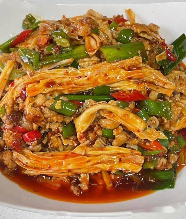 1. 腐竹泡发切段,炒香肉末、豆瓣酱。