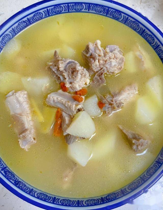 7. 盛出装碗,山药排骨汤汤色乳白,排骨酥烂脱骨,山药软糯香甜,喝一口暖身又暖心。