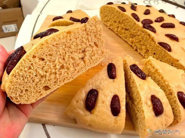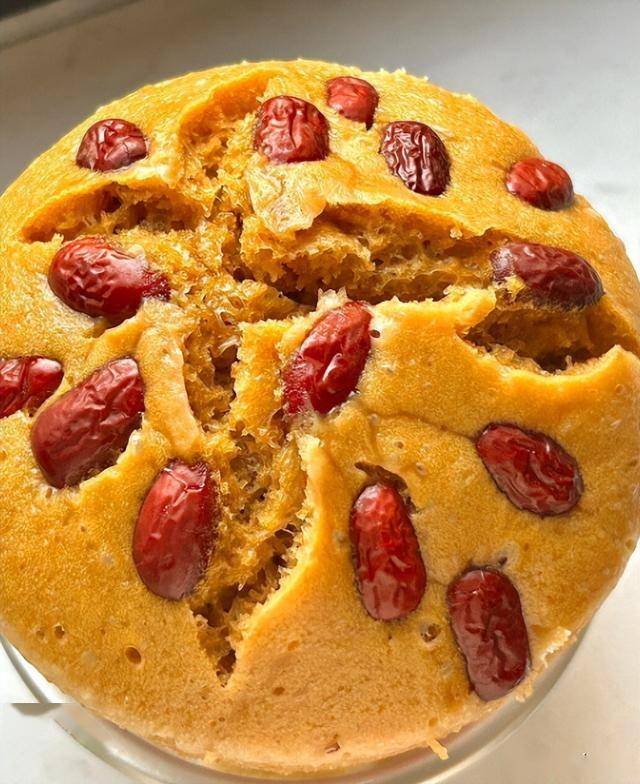 7. 关火后焖5分钟(防止发糕突然遇冷回缩),取出晾凉后脱模,红枣发糕松软香甜,枣香浓郁,寓意“早发家、福满门”。