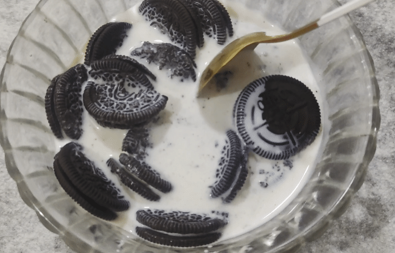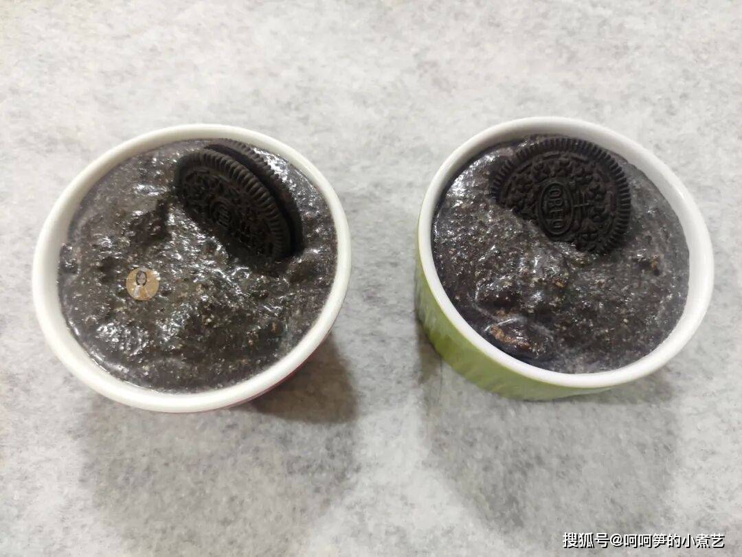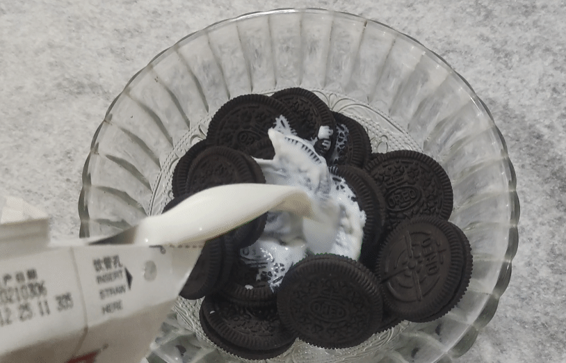 先泡一泡,奥利奥会变软,然后用勺子搅一搅就碎了。