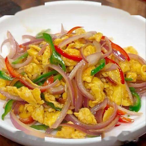 6. 将炒好的鸡蛋倒回锅中,与洋葱一起翻炒均匀。