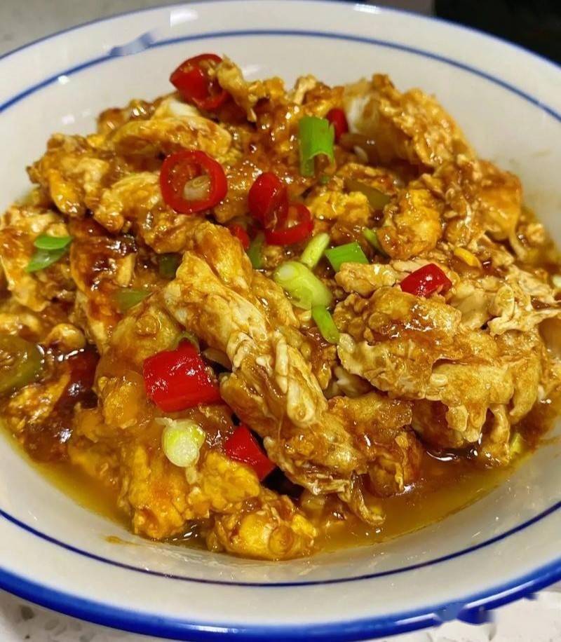 5. 把调好的醋汁淋进锅里,快速翻炒均匀,让每块鸡蛋都裹上酸酸的汤汁。