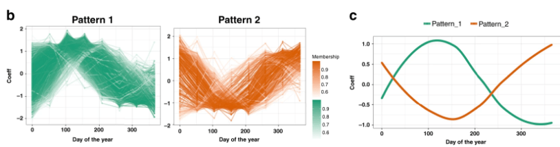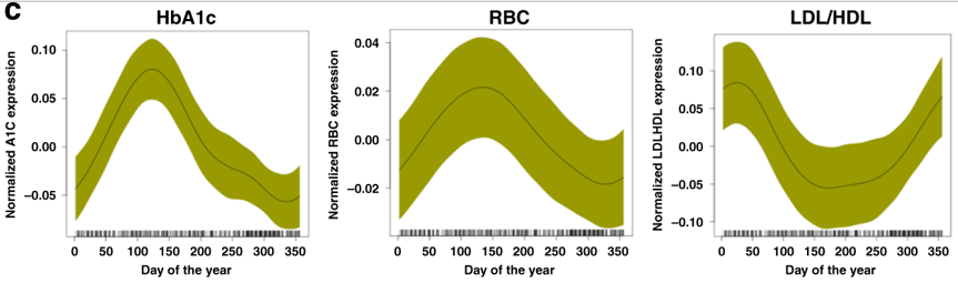 通过对人群中的多个组学数据进行探究,研究人员发现,人体的不少指标的确存在季节性变化。不过,这个季节性可能不像我们理解的四季,而是更像冷/热变化,如下图所示,在每年的100天左右,也就是2、3、4月,人体的代谢模式呈现出了明显的高位/低位。