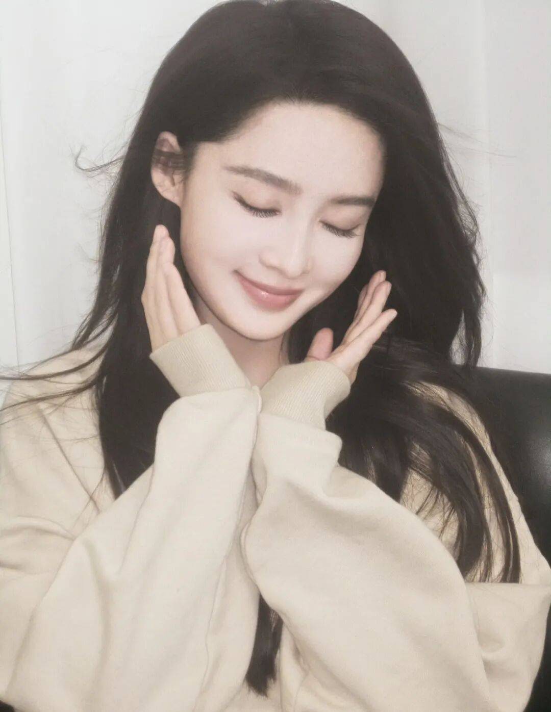 没有多余的配饰,只靠一头蓬松的深棕大波浪长发就撑起了整个造型。微乱的发丝随风飘动,闭眼浅笑的模样,把清冷和温婉两种气质融合得恰到好处。