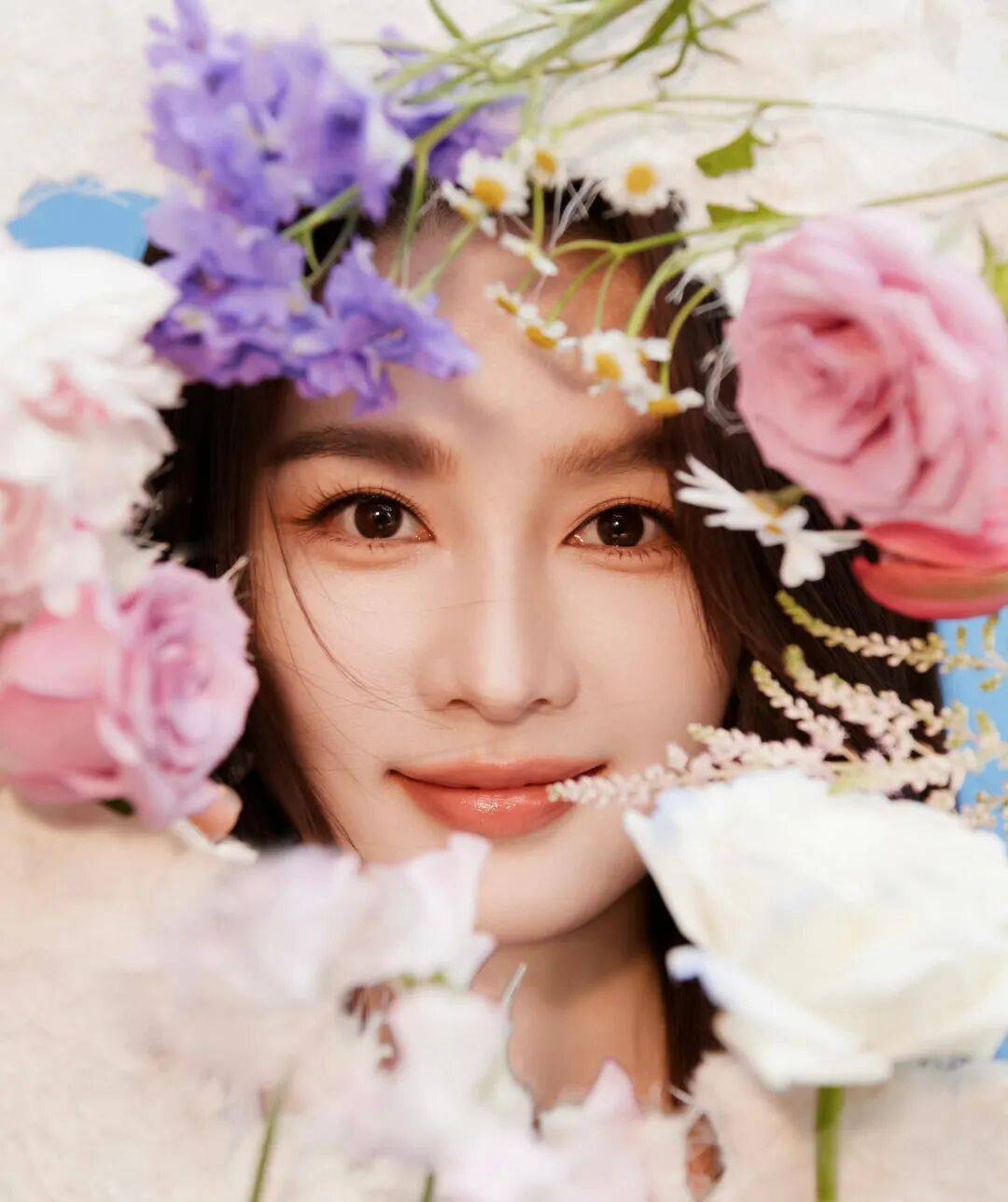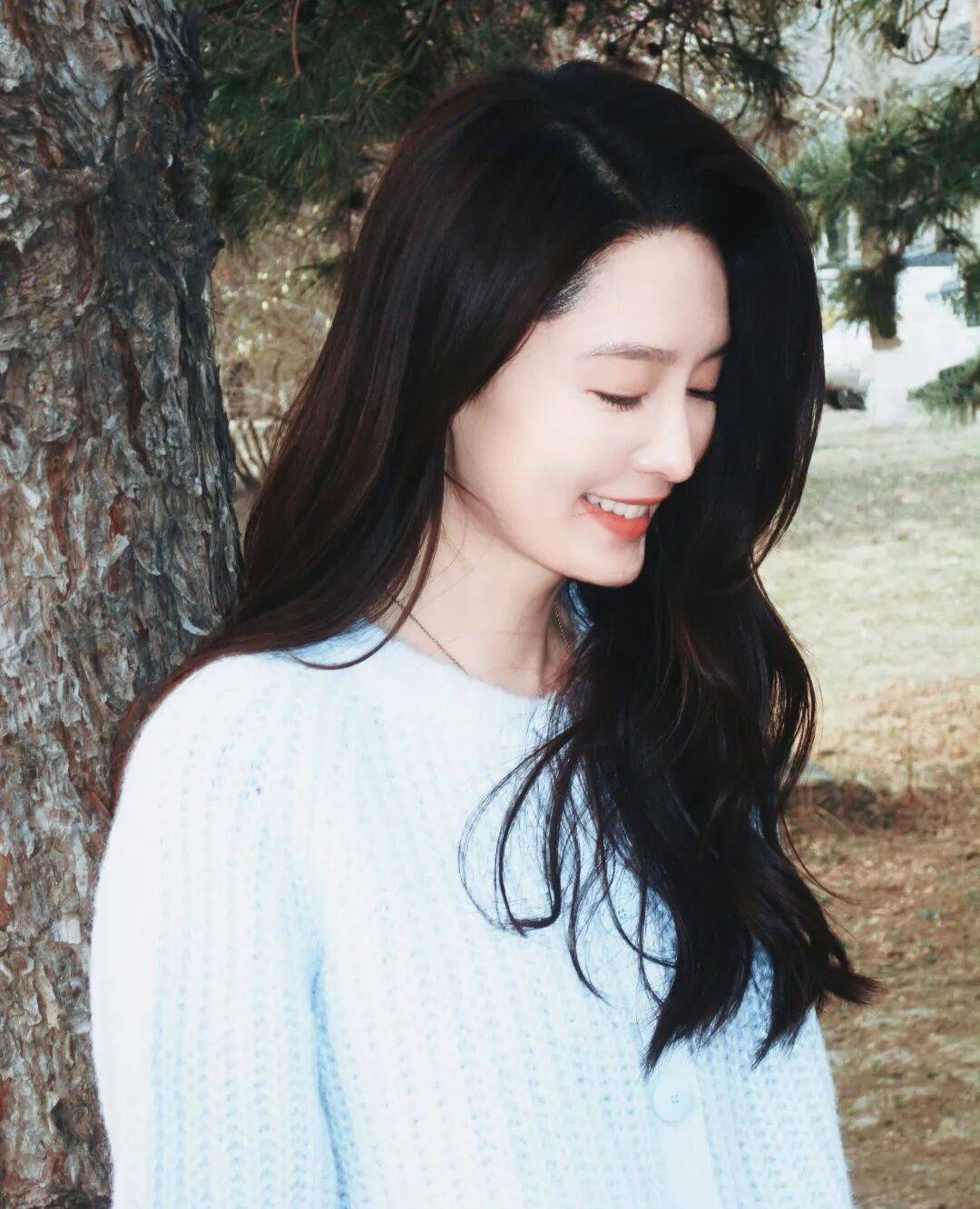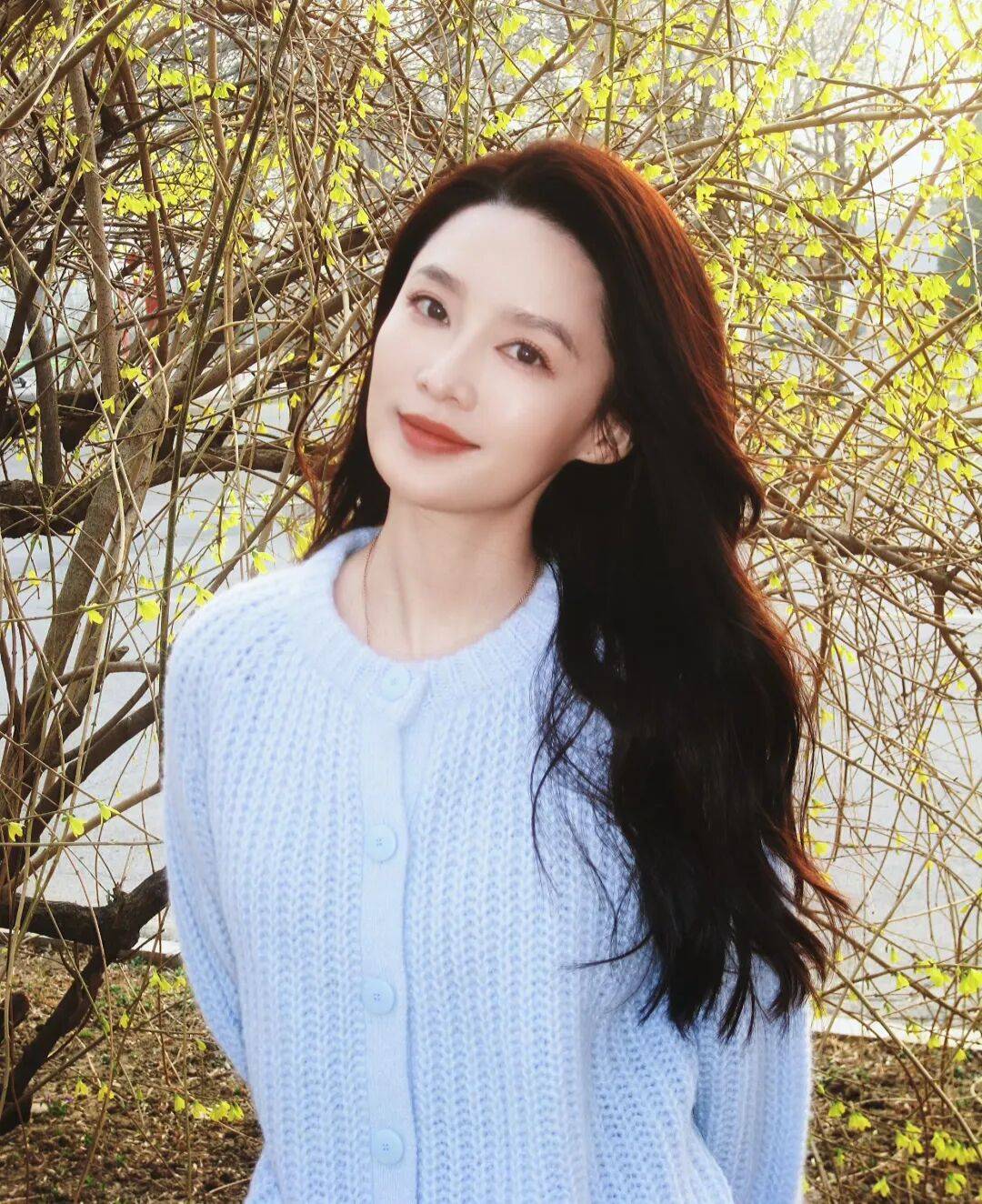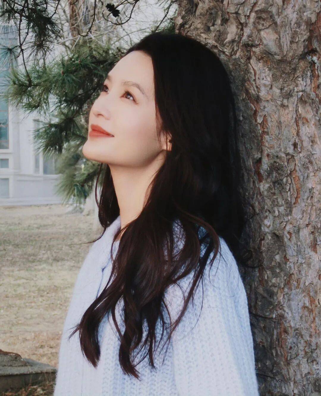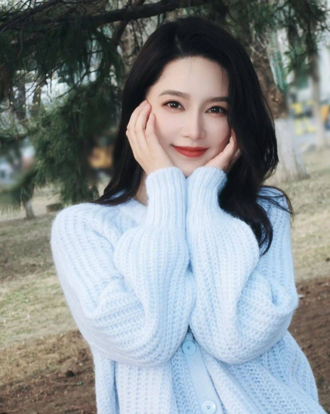 最绝的是这个干净的baby蓝,衬得皮肤白皙通透,和她的黑长直卷发适配度满分。双手托腮的笑容甜度超标,在松枝背景的映衬下,整个人像春日里的一缕清风。
