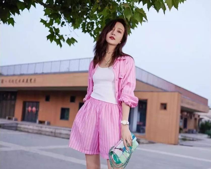 王鸥一改往日御姐形象,以粉色条纹短裤搭配同款衬衣展现清纯魅力。低饱和樱花粉颜色甜而不腻,细条纹设计轻盈有呼吸感,宽松版型藏肉又随性,短裤露脚踝显腿长,衬衣下摆半扎进裤腰,俏皮又优雅。