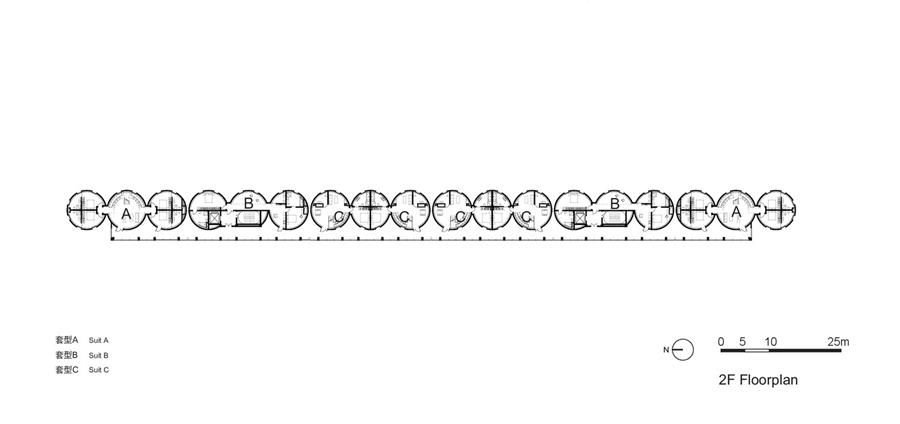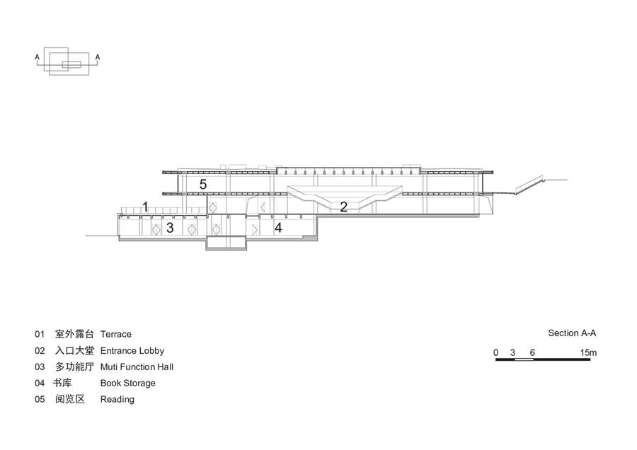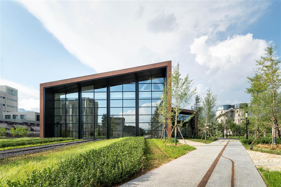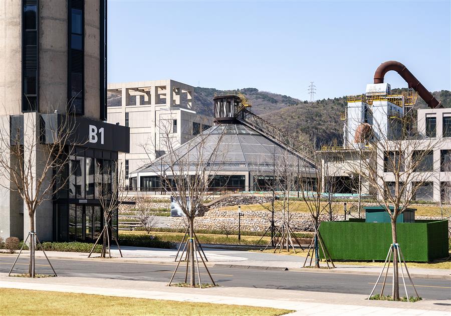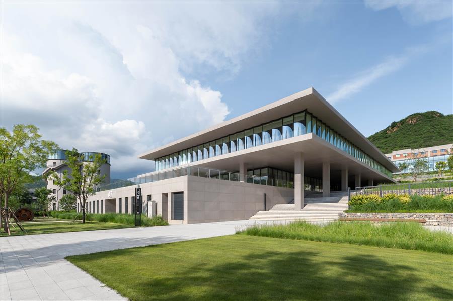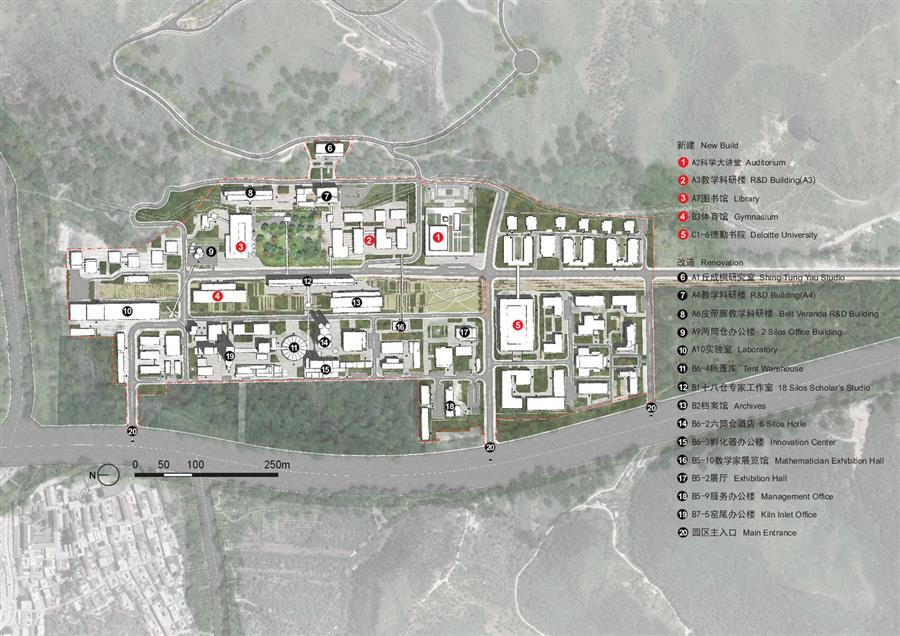 金隅兴发科技园是由北京怀柔科学城的一座水泥厂改造而成的国际前沿研发园区。多功能科学园占地约36公顷,其特点是保存了54栋建筑。 The Jinyu Xingfa Science Park has emerged as a campus for international cutting-edge research and development through the transformation of a former cement factory in Huairou Science City, Beijing. The multifunctional science park covers an area of approximately 36 hectares and is characterized by the preservation of 54 buildings. 这些建筑经过改造和重新利用,形成了新的建筑,成为北京数学科学研究所。新园现在逐渐恢复生机,里面有实验室、研究设施以及供研究人员和学生使用的住宅单元。 These structures have been revitalized and repurposed, with precisely integrated new constructions, to become the Beijing Institute for Mathematical Sciences. The new park, now gradually coming to life, houses laboratories, research facilities, and residential units for researchers and students. 该设计代表了可持续的复兴,讲述了基地的工业故事,并延续了它的遗产。它整合了贯穿场地南北的货运铁路,作为景观和文化的重要骨干,连接了所有功能区:雁栖湖应用数学研究所、管理区、研究所、专家工作室区和办公孵化器。 The design represents sustainable revitalization, telling the site's industrial story and continuing its legacy. It integrates the freight railway running north to south through the site as a landscape and culturally significant backbone, connecting all functional zones: the Yanqi Lake Institute of Applied Mathematics, a management area, a research institute, an expert studio area, and an office incubator. 为了实现最大限度保护的指导原则,必须单独对待每座建筑的结构和特征,并制定量身定制的解决方案。这包括将锥形帐篷仓库改造成多功能展厅,将石灰石均质筒仓改造成大型实验室,将带廊和仓储建筑改造成教学楼,将水泥装袋平台改造成科学档案博物馆。 To fulfill the guiding principle of maximum preservation, it was essential to treat each building's fabric and character individually and to develop tailor-made solutions. This included the transformation of the conical tent warehouse into a multifunctional exhibition hall, the limestone homogenization silo into a large laboratory, the belt corridor and storage building into a teaching building, and the cement bagging platform into a scientific archive museum. 最艰巨的任务之一是将新的住宅功能整合到现有的大型筒仓结构框架中,辅以休息区、日常便利店、餐厅和会议设施。 One of the most demanding tasks was incorporating new residential functions into the framework of the existing large-scale silo structure, complemented by lounge areas, daily convenience shops, restaurants, and conference facilities. 为了配合新的功能,图书馆、大型演讲厅、体育馆、数学家工作室、展厅和员工自助餐厅都被添加进来。图书馆采用阶梯式设计,连接三层,创造多样化的活动平台。讲堂遵循山的轮廓,包含各种礼堂和多功能空间。 In line with the new functions, a library, a large lecture hall, a gymnasium, a mathematician's studio, an exhibition hall, and a staff cafeteria have been added. The library adopts a stepped design, connecting three levels and creating diverse activity platforms. The lecture hall follows the mountain's contours and contains various auditoriums and multifunctional spaces. 数学家体育馆是体育活动的主要场所。现在,该项目将一个曾经崎岖不平、难以进入的工业基地变成了一个充满活力、多功能的科学园区,为生活、学习和工作提供了一个有吸引力的、面向自然的环境。 The Mathematicians' Gymnasium serves as the primary space for sports activities. Now, the project has turned a once rugged, inaccessible industrial site into a vibrant, multifunctional science park offering an attractive, nature-oriented environment for living, learning, and working. 项目图纸▲平面图 ▲剖面图