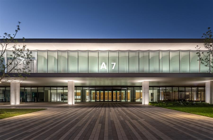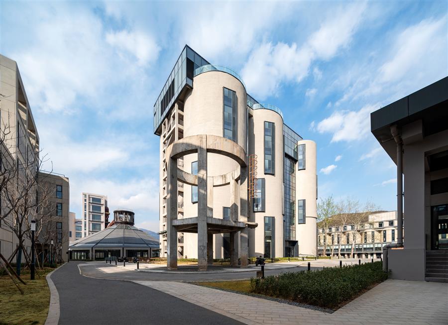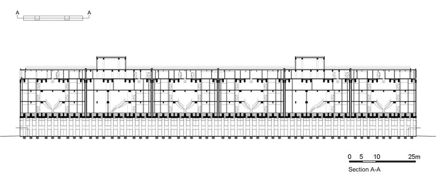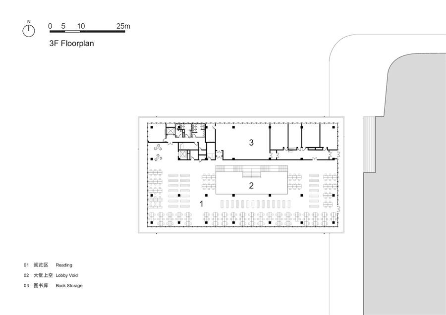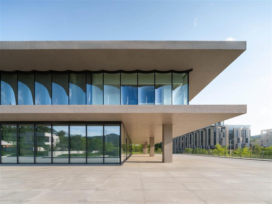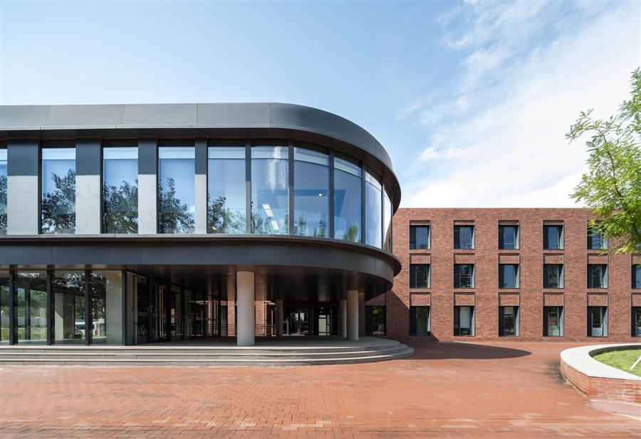 金隅兴发科技园是由北京怀柔科学城的一座水泥厂改造而成的国际前沿研发园区。多功能科学园占地约36公顷,其特点是保存了54栋建筑。 The Jinyu Xingfa Science Park has emerged as a campus for international cutting-edge research and development through the transformation of a former cement factory in Huairou Science City, Beijing. The multifunctional science park covers an area of approximately 36 hectares and is characterized by the preservation of 54 buildings. 这些建筑经过改造和重新利用,形成了新的建筑,成为北京数学科学研究所。新园现在逐渐恢复生机,里面有实验室、研究设施以及供研究人员和学生使用的住宅单元。 These structures have been revitalized and repurposed, with precisely integrated new constructions, to become the Beijing Institute for Mathematical Sciences. The new park, now gradually coming to life, houses laboratories, research facilities, and residential units for researchers and students. 该设计代表了可持续的复兴,讲述了基地的工业故事,并延续了它的遗产。它整合了贯穿场地南北的货运铁路,作为景观和文化的重要骨干,连接了所有功能区:雁栖湖应用数学研究所、管理区、研究所、专家工作室区和办公孵化器。 The design represents sustainable revitalization, telling the site's industrial story and continuing its legacy. It integrates the freight railway running north to south through the site as a landscape and culturally significant backbone, connecting all functional zones: the Yanqi Lake Institute of Applied Mathematics, a management area, a research institute, an expert studio area, and an office incubator. 为了实现最大限度保护的指导原则,必须单独对待每座建筑的结构和特征,并制定量身定制的解决方案。这包括将锥形帐篷仓库改造成多功能展厅,将石灰石均质筒仓改造成大型实验室,将带廊和仓储建筑改造成教学楼,将水泥装袋平台改造成科学档案博物馆。 To fulfill the guiding principle of maximum preservation, it was essential to treat each building's fabric and character individually and to develop tailor-made solutions. This included the transformation of the conical tent warehouse into a multifunctional exhibition hall, the limestone homogenization silo into a large laboratory, the belt corridor and storage building into a teaching building, and the cement bagging platform into a scientific archive museum. 最艰巨的任务之一是将新的住宅功能整合到现有的大型筒仓结构框架中,辅以休息区、日常便利店、餐厅和会议设施。 One of the most demanding tasks was incorporating new residential functions into the framework of the existing large-scale silo structure, complemented by lounge areas, daily convenience shops, restaurants, and conference facilities. 为了配合新的功能,图书馆、大型演讲厅、体育馆、数学家工作室、展厅和员工自助餐厅都被添加进来。图书馆采用阶梯式设计,连接三层,创造多样化的活动平台。讲堂遵循山的轮廓,包含各种礼堂和多功能空间。 In line with the new functions, a library, a large lecture hall, a gymnasium, a mathematician's studio, an exhibition hall, and a staff cafeteria have been added. The library adopts a stepped design, connecting three levels and creating diverse activity platforms. The lecture hall follows the mountain's contours and contains various auditoriums and multifunctional spaces. 数学家体育馆是体育活动的主要场所。现在,该项目将一个曾经崎岖不平、难以进入的工业基地变成了一个充满活力、多功能的科学园区,为生活、学习和工作提供了一个有吸引力的、面向自然的环境。 The Mathematicians' Gymnasium serves as the primary space for sports activities. Now, the project has turned a once rugged, inaccessible industrial site into a vibrant, multifunctional science park offering an attractive, nature-oriented environment for living, learning, and working. 项目图纸▲平面图 ▲剖面图