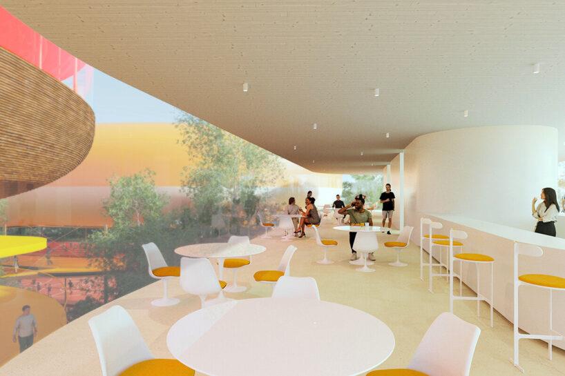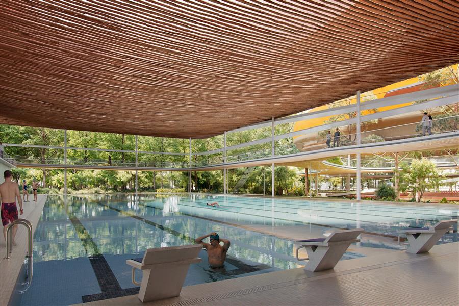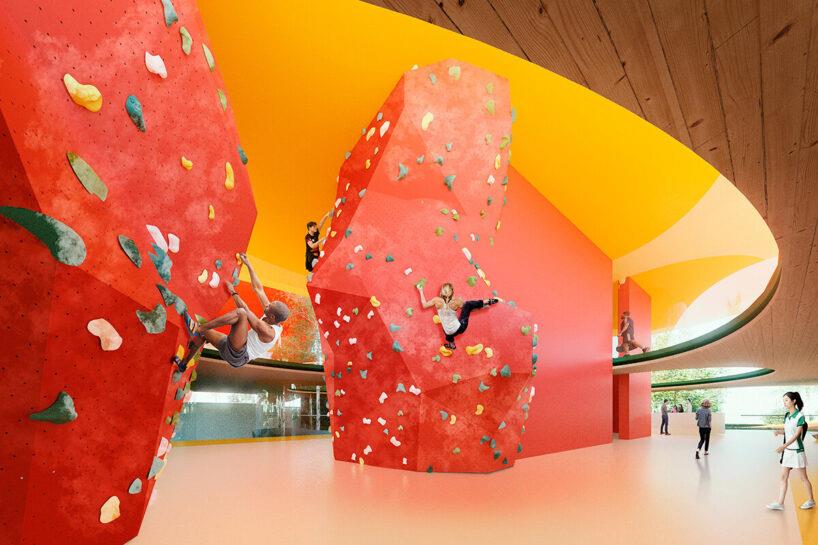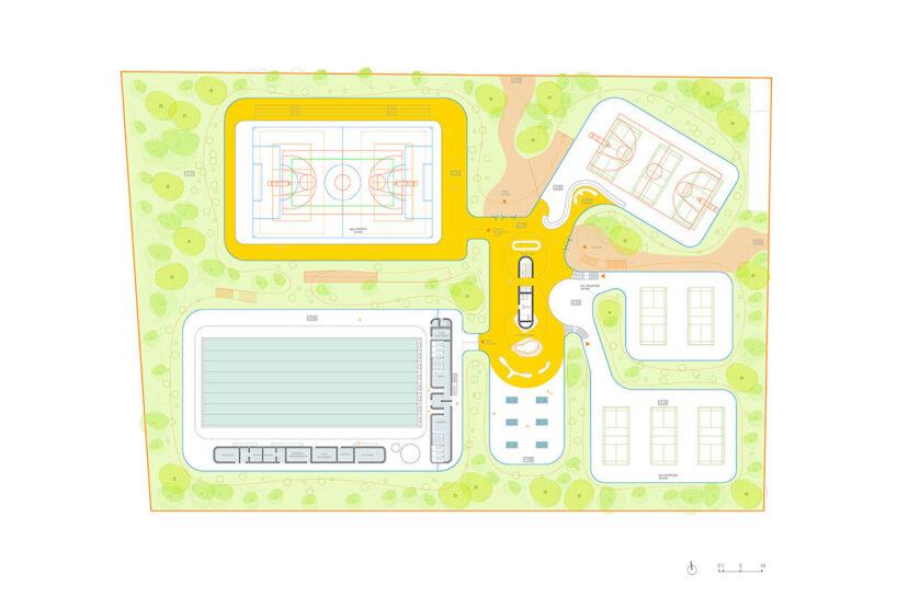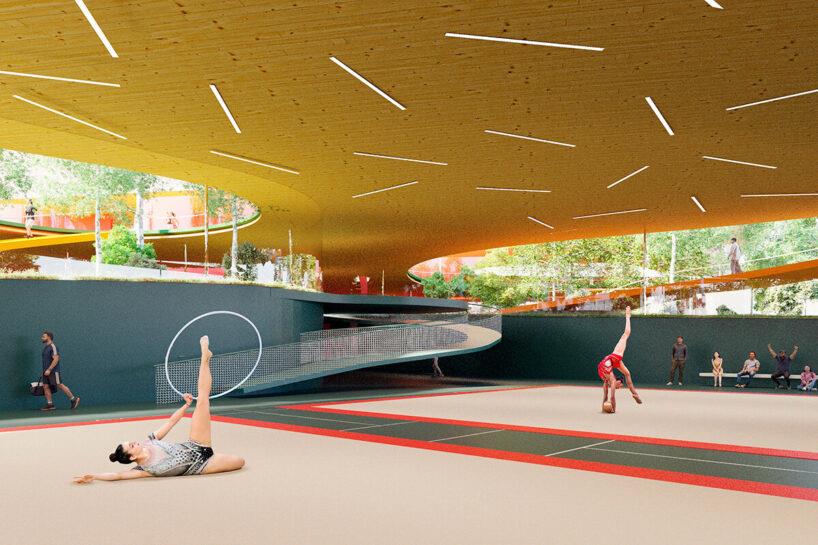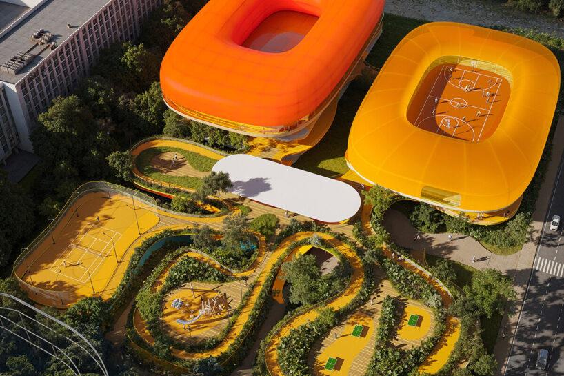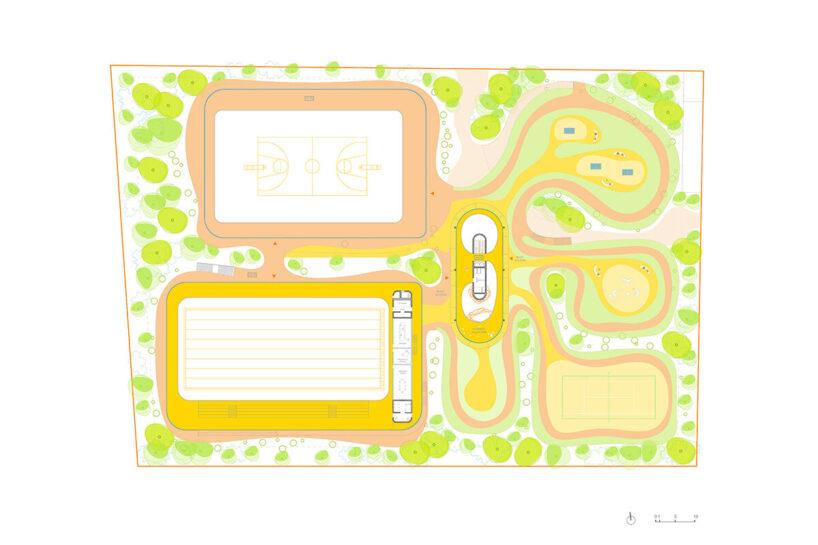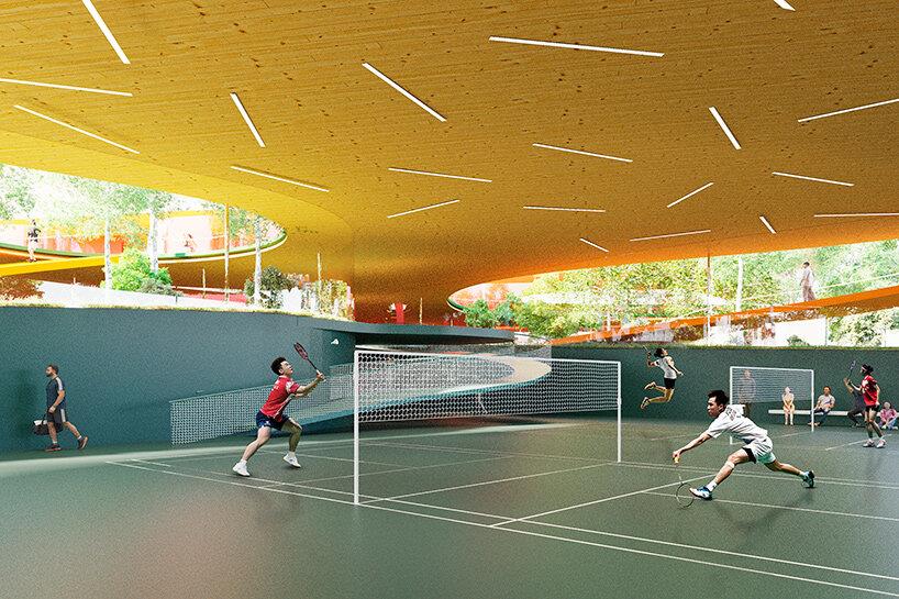 西班牙建筑工作室Selgascano设计的泗泾镇体育中心在上海郊区获得了二等奖,被认为是一个可持续的、人性化的地标性建筑。该项目规划在交通路线和绿色走廊之间,强调可达性和积极的机动性,将慢跑道、自行车道和附近的公园连接到一个更广泛的健康公共空间网络中。 The Sijing Town Sports Center, designed by Spanish architecture studio Selgascano, has won second prize for a site on the outskirts of Shanghai and conceived as a sustainable, human-scale landmark. Planned between transport routes and green corridors, the project emphasizes accessibility and active mobility, linking jogging paths, bike trails, and nearby parks into a wider network of wellness-focused public space. 与周围高密度的发展形成对比,体育中心引入了一种植根于开放和景观融合的建筑语言。设计避免了垂直优势,而是将其分散在一系列低矮、透明的亭子上,这些亭子有大量的ETFE屋顶。每个体量都被绿色植物包围,使项目与自然环境保持一致,并为天际线的速度和规模创造了平静的平衡。 In contrast to the surrounding high-density developments, the sports center introduces an architectural language rooted in openness and landscape integration. The design avoids vertical dominance, instead dispersing its program across a series of low, transparent pavilions with voluminous ETFE rooftops. Each volume is enveloped in greenery, aligning the project with the natural environment and creating a calm counterbalance to the speed and scale of the skyline beyond. Selgascano从中国传统水乡中汲取灵感,设计了四京镇体育中心展馆的布局。在这里,桥梁、庭院和步道构成了日常生活。这些元素作为空间节奏出现在这里,将室内活动与室外流通联系起来,在支持社区使用的同时加强文化的连续性。通过拥抱地面平面,建筑师优先考虑人类尺度和感官参与,而不是一个不受街道欢迎的纪念性形式。 With the layout of the Sijing Town Sports Center’s pavilions, Selgascano draws inspiration from traditional Chinese water towns. Here, bridges, courtyards, and walking paths structure daily life. These elements appear here as spatial rhythms that connect interior activity with outdoor circulation, reinforcing cultural continuity while supporting community use. By embracing the ground plane, the architects prioritizes human scale and sensory engagement over a monumental form that feels unwelcoming from the street. 尽管如此,两个雕塑和有机体量仍然是项目的焦点。它们流畅的几何形状和大胆的存在建立了一个可识别的身份,同时保持与水平构图一致。这种平衡使体育中心作为地标而不依赖于大小,而是通过材料、比例和氛围产生共鸣。 Still, two sculptural and organic volumes serve as the project’s focal points. Their fluid geometry and bold presence establish a recognizable identity while remaining consistent with the horizontal composition. This balance allows the sports center to act as a landmark without relying on size, instead generating resonance through materiality, proportion, and atmosphere. 泗泾镇体育中心被组织成不同的区域,用于游泳、多功能运动场和羽毛球,每个区域都设计有很强的室内外联系。被动式策略和智能技术支持气候控制和运营效率,而材料面板则突出了环境性能。ETFE膜、回收格子呢、木材元素和低voc饰面都有助于项目的可持续发展目标。 The Sijing Town Sports Center is organized into distinct zones for swimming, multi-sport courts, and badminton, each designed with strong indoor-outdoor connections. Passive strategies and smart technologies support climate control and operational efficiency, while the material palette foregrounds environmental performance. ETFE membranes, recycled tartan, timber elements, and low-VOC finishes all contribute to the project’s sustainability goals. 日光被精心地融入到设计中,在白天使用时创造出明亮而充满活力的室内空间。到了晚上,人工照明将亭子变成景观中的发光灯塔。这种双重性强化了建筑的公民角色,确保中心全天保持可见和可达的朝向。 Daylight is carefully integrated into the design, creating bright and animated interiors during daytime use. At night, artificial illumination transforms the pavilions into glowing beacons within the landscape. This duality reinforces the building’s civic role, ensuring that the center remains a visible and accessible point of orientation throughout the day.