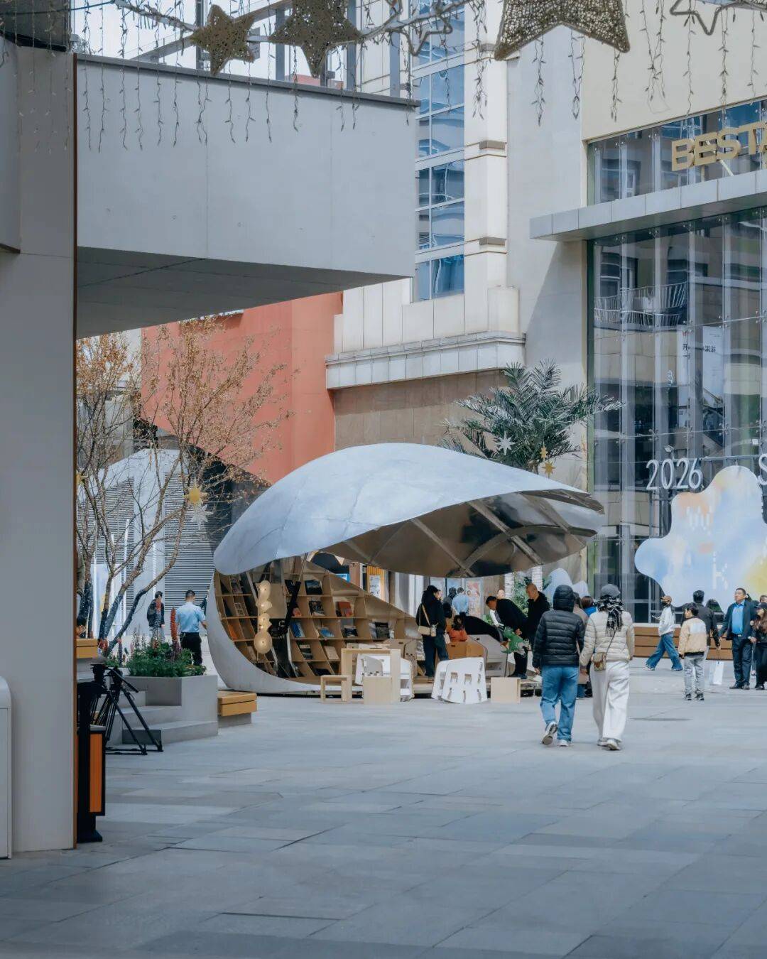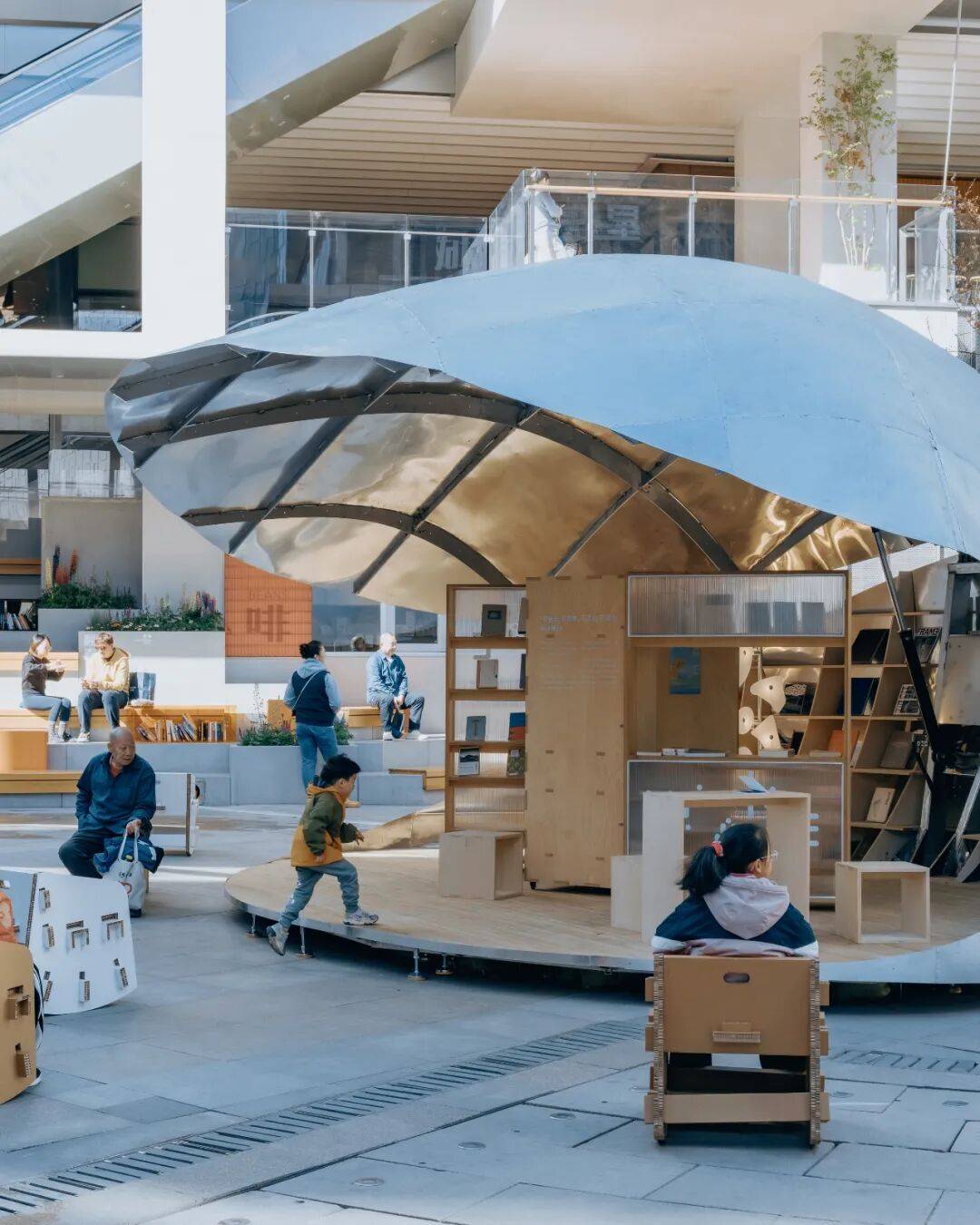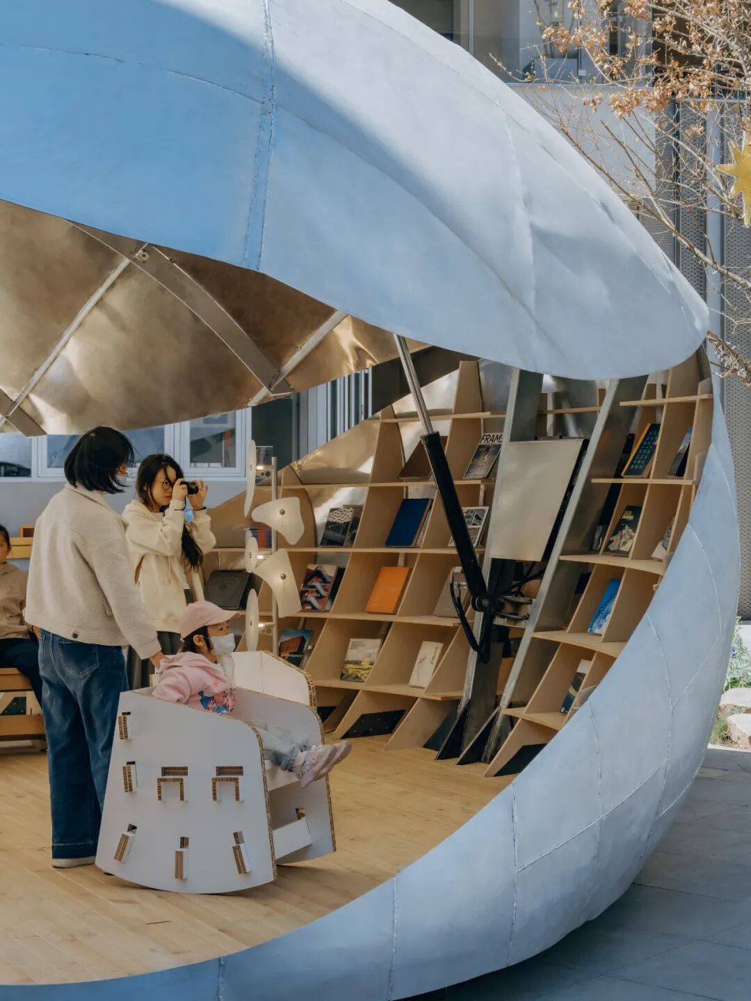 贝壳书屋以轻盈的壳体、灵活的开合与精密的技术,重新定义了社区商业区的公共空间。它不仅是阅读场所,更是一个会呼吸、会变化的“活态装置”,在广场中央持续生成新的公共关系。正如设计师所言:“重要的不是固定形象,而是通过变化让空间参与社区生活。”