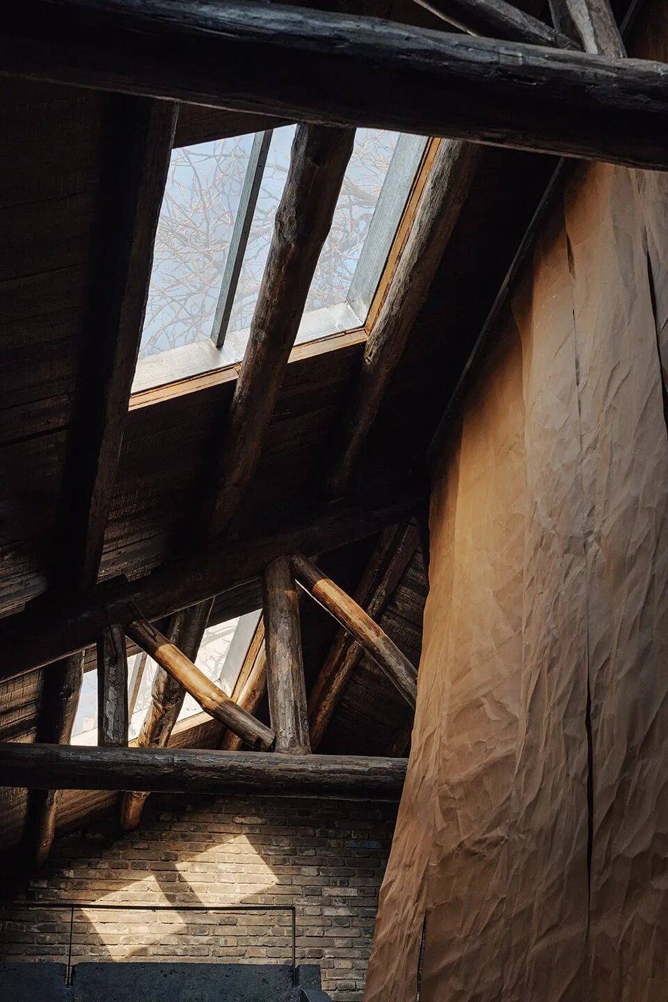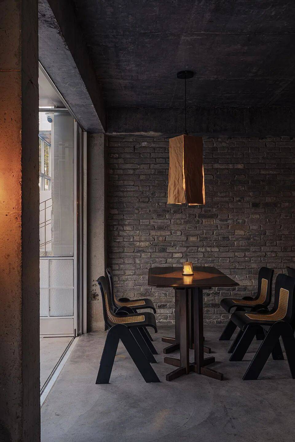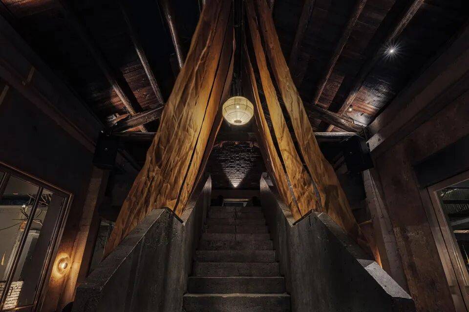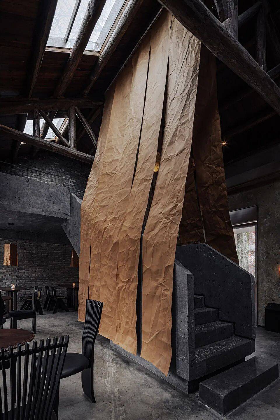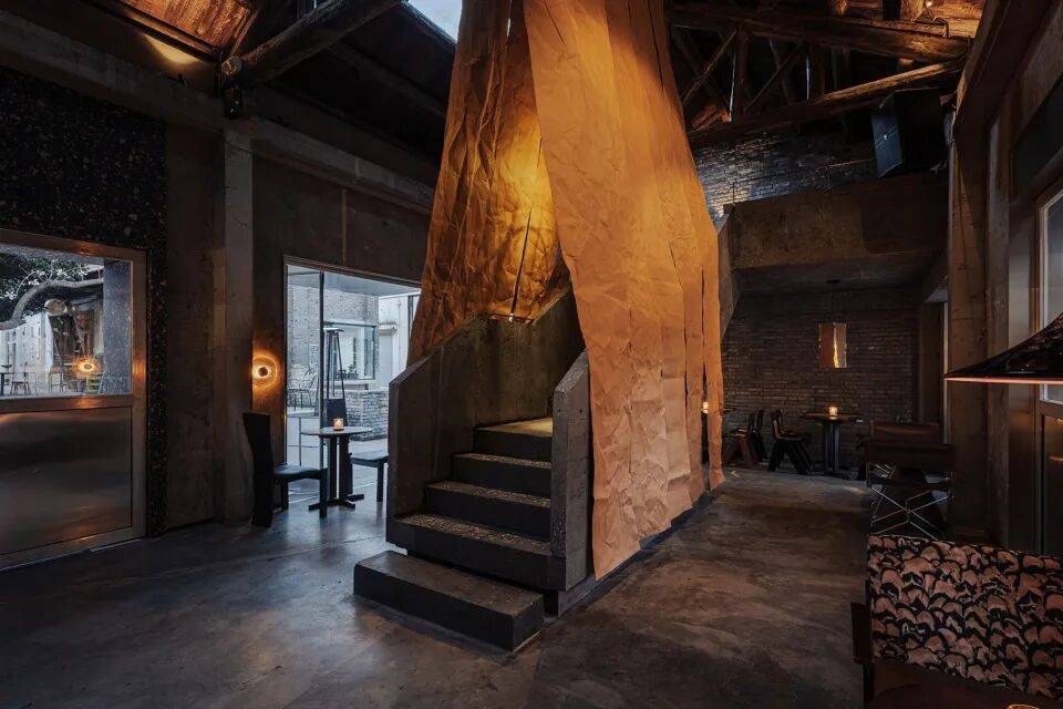 牛皮纸艺术装置:黑色混凝土楼梯两侧悬挂牛皮纸,在复古灯光下形成“凝固的光影瀑布”,柔化空间冷峻感;