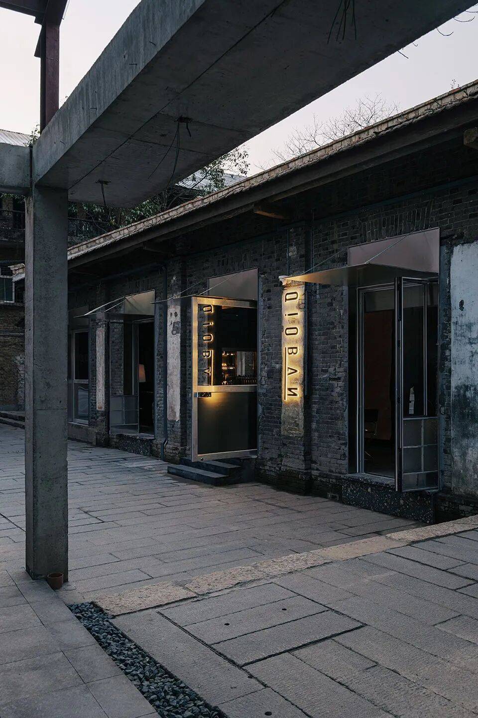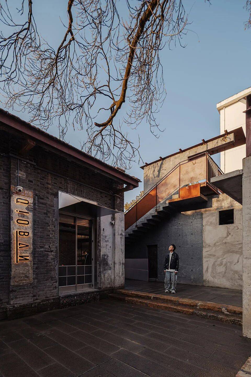 材质对比:黑色混凝土与锈蚀钢板(街区基调)与原始红砖形成粗野与细腻的张力。