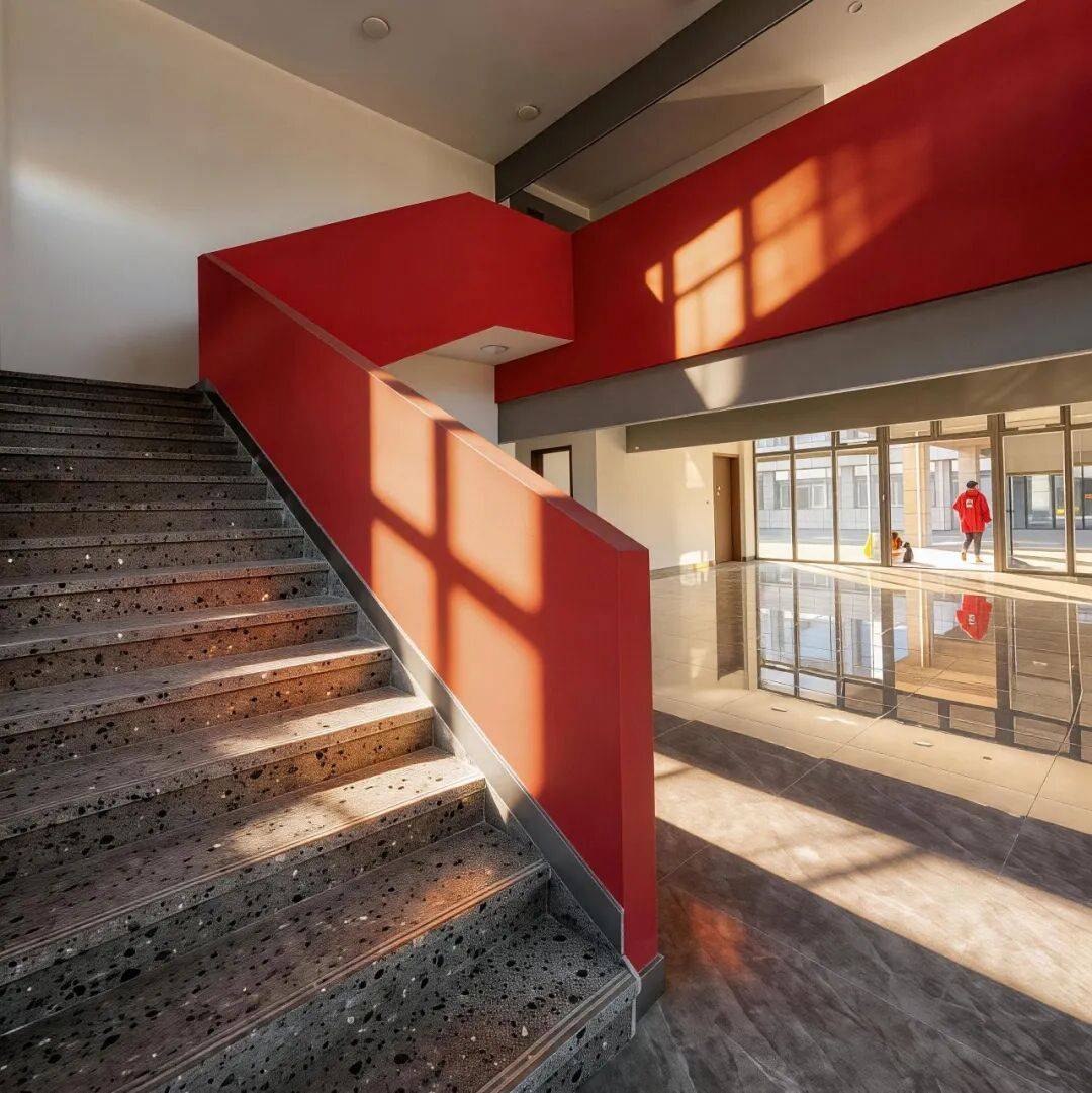 空间温度:主入口红色楼梯打破灰调压抑感,水磨石地面便于清洁,二层庭院提供休闲场所;