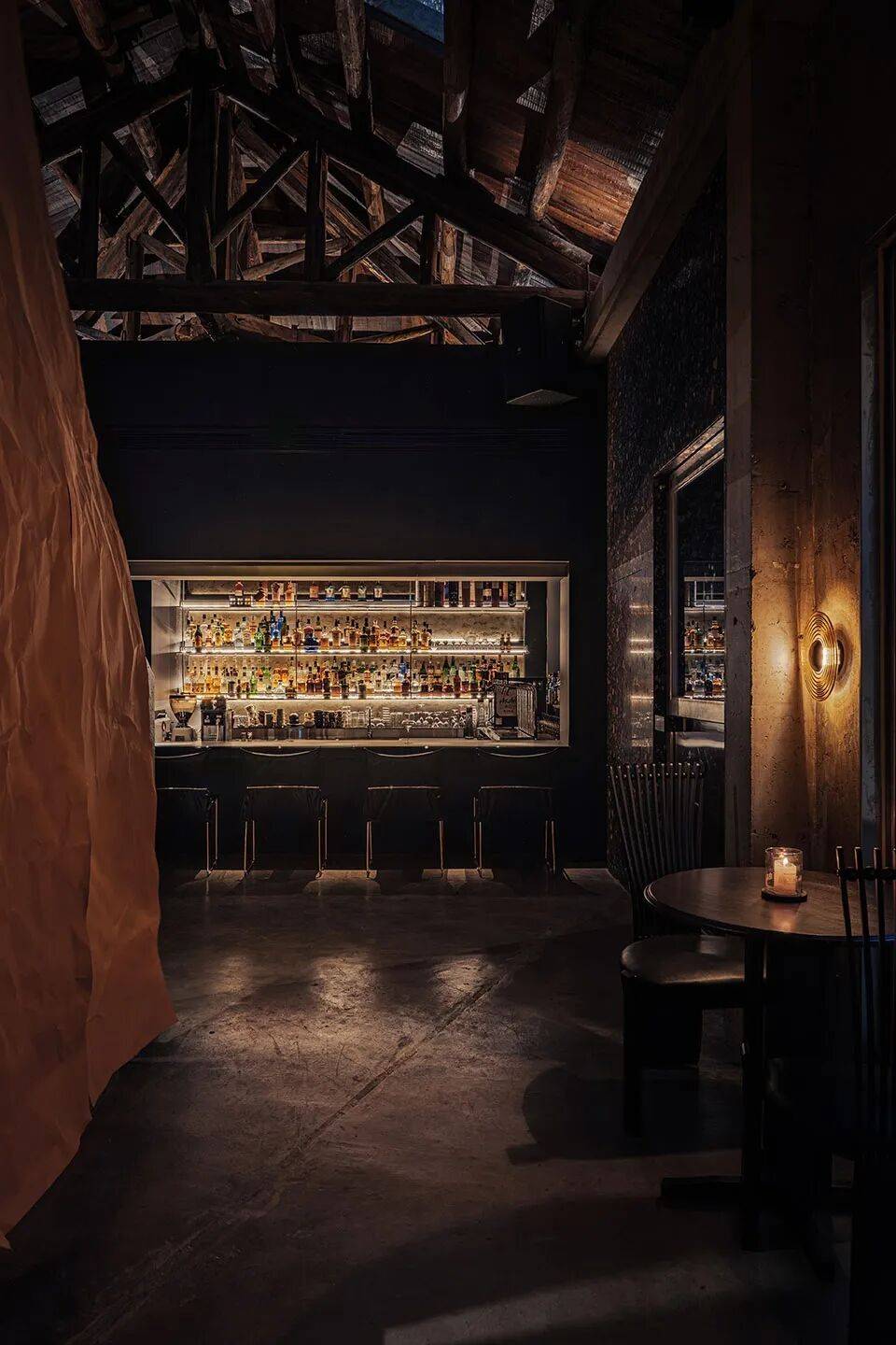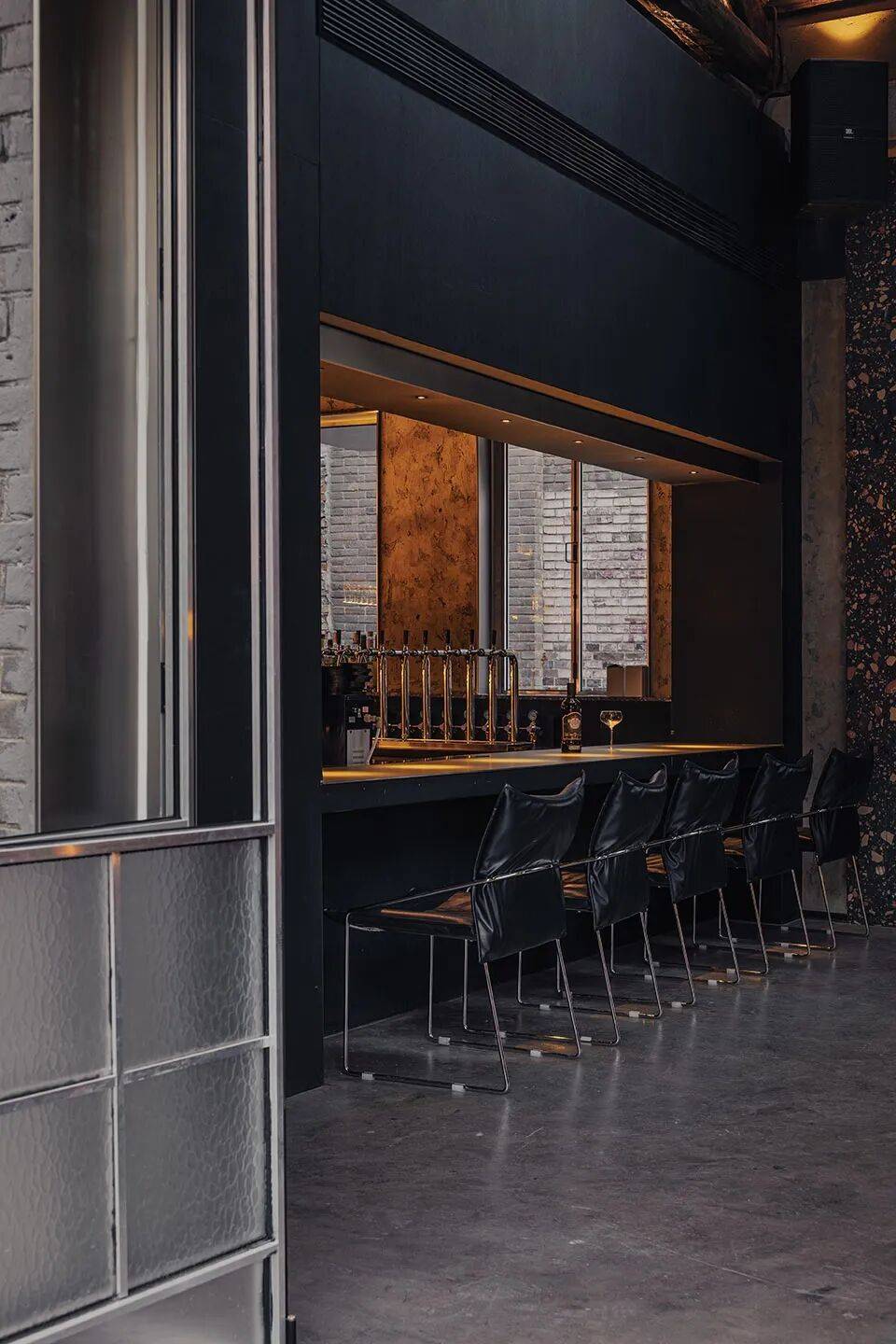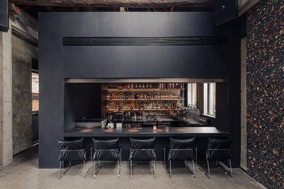核心吧台:定义为“黑色盒子”,直接嵌入老建筑,形成视觉焦点;