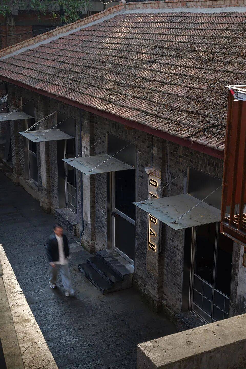 雨棚设计:所有门窗开洞增设镀锌铁板雨棚,以现代工业语言对话旧建筑;