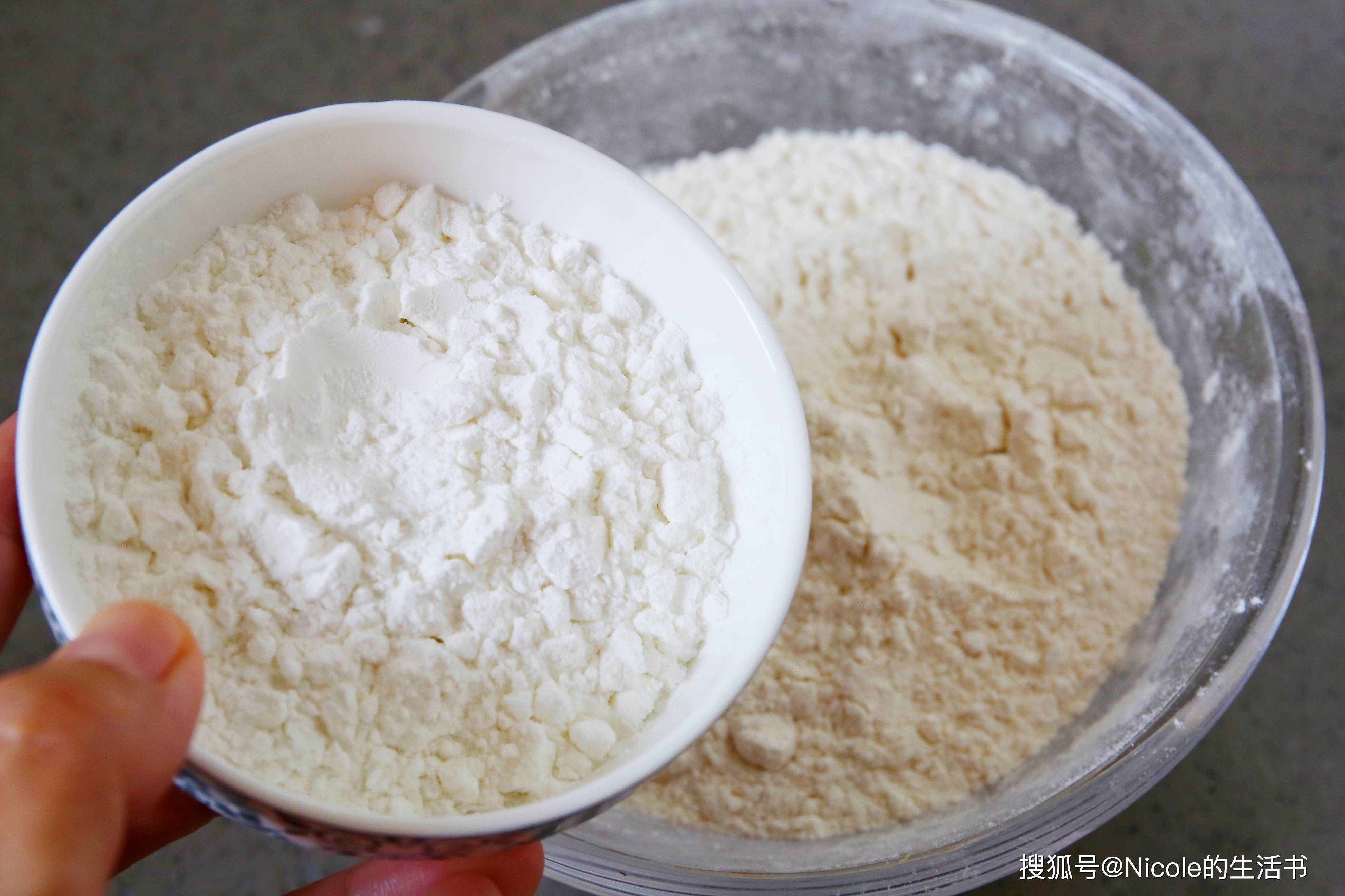 5. 粉类准备:将玉米淀粉倒入燕麦小麦粉中。