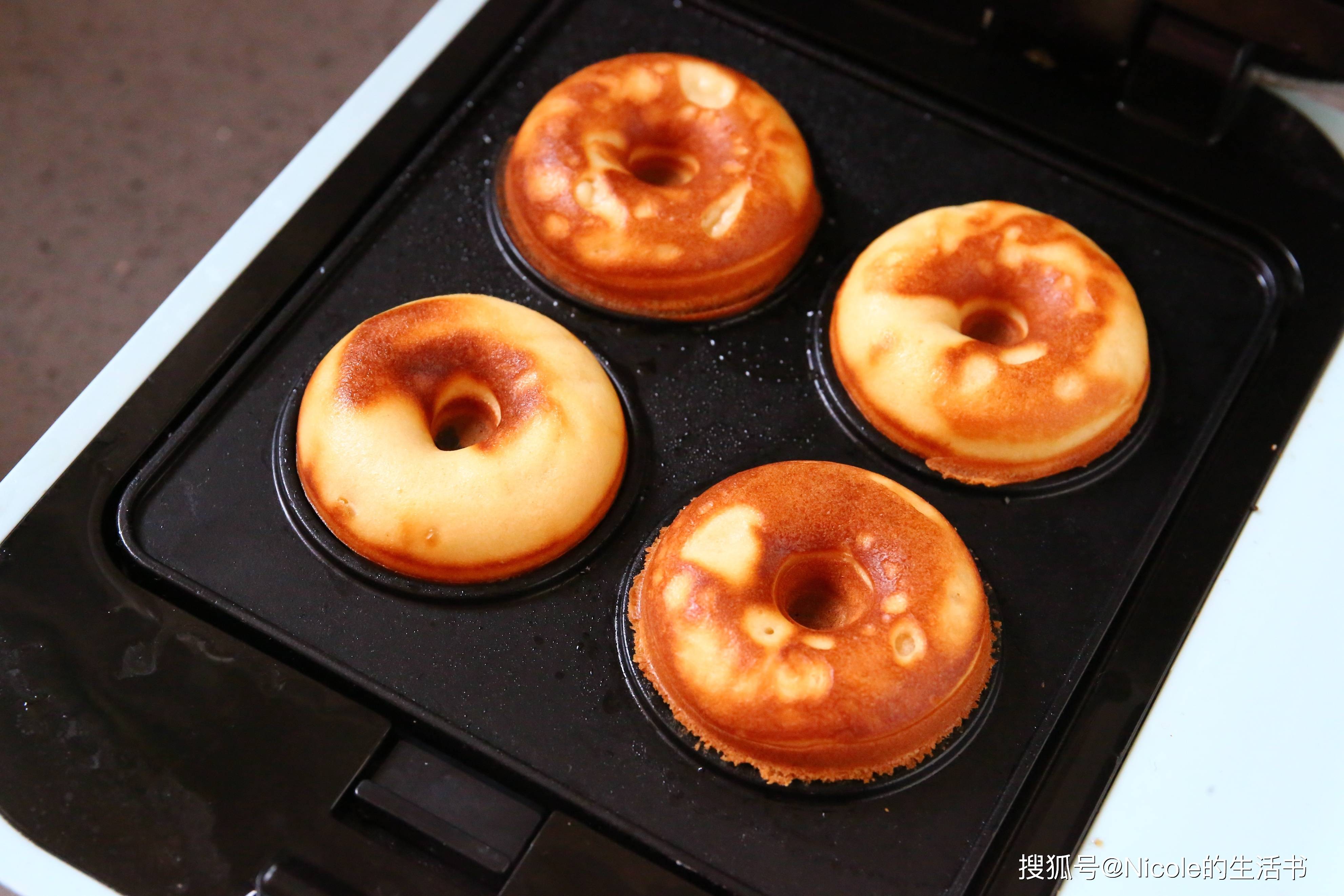 将面糊舀入甜甜圈模具中,加热6分钟左右即可烤熟