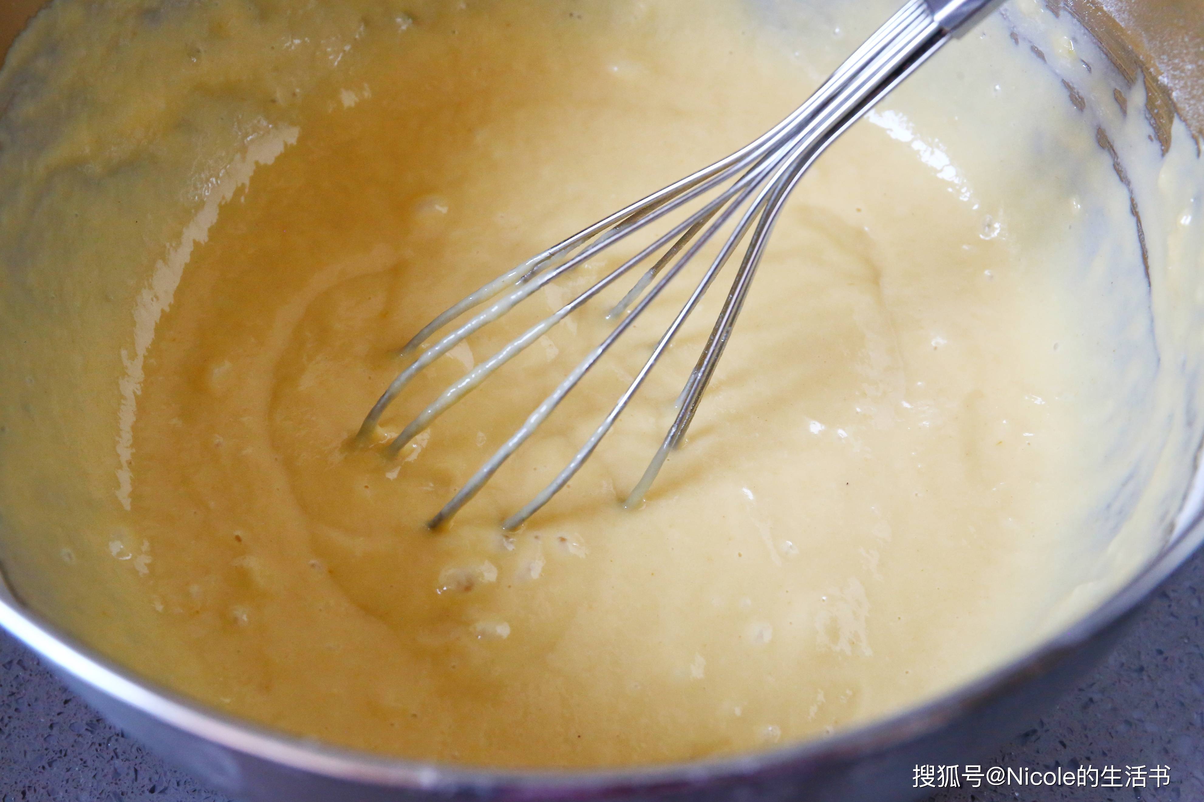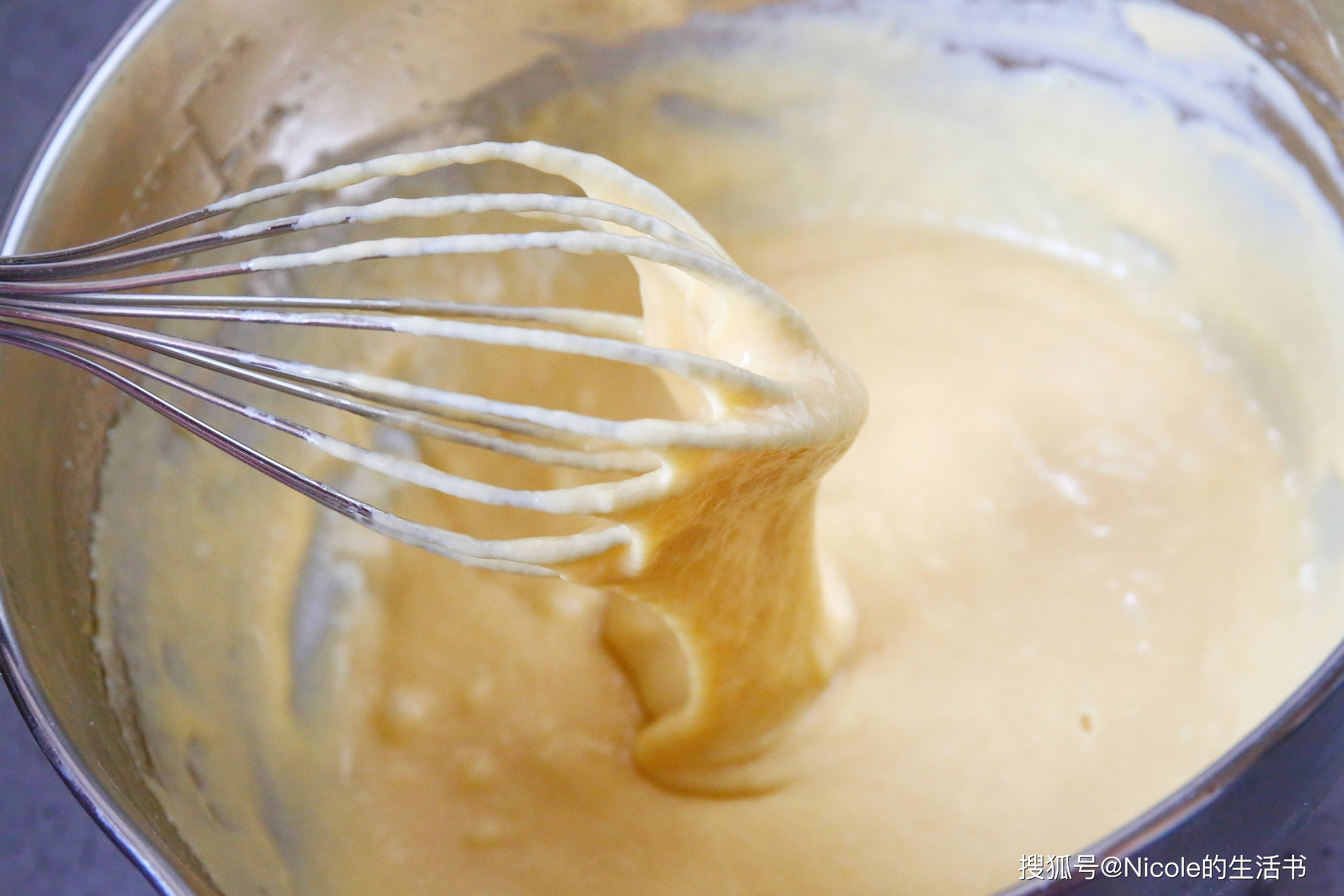 7. 筛入蛋奶糊:将混合好的粉类一起筛入蛋奶糊中。