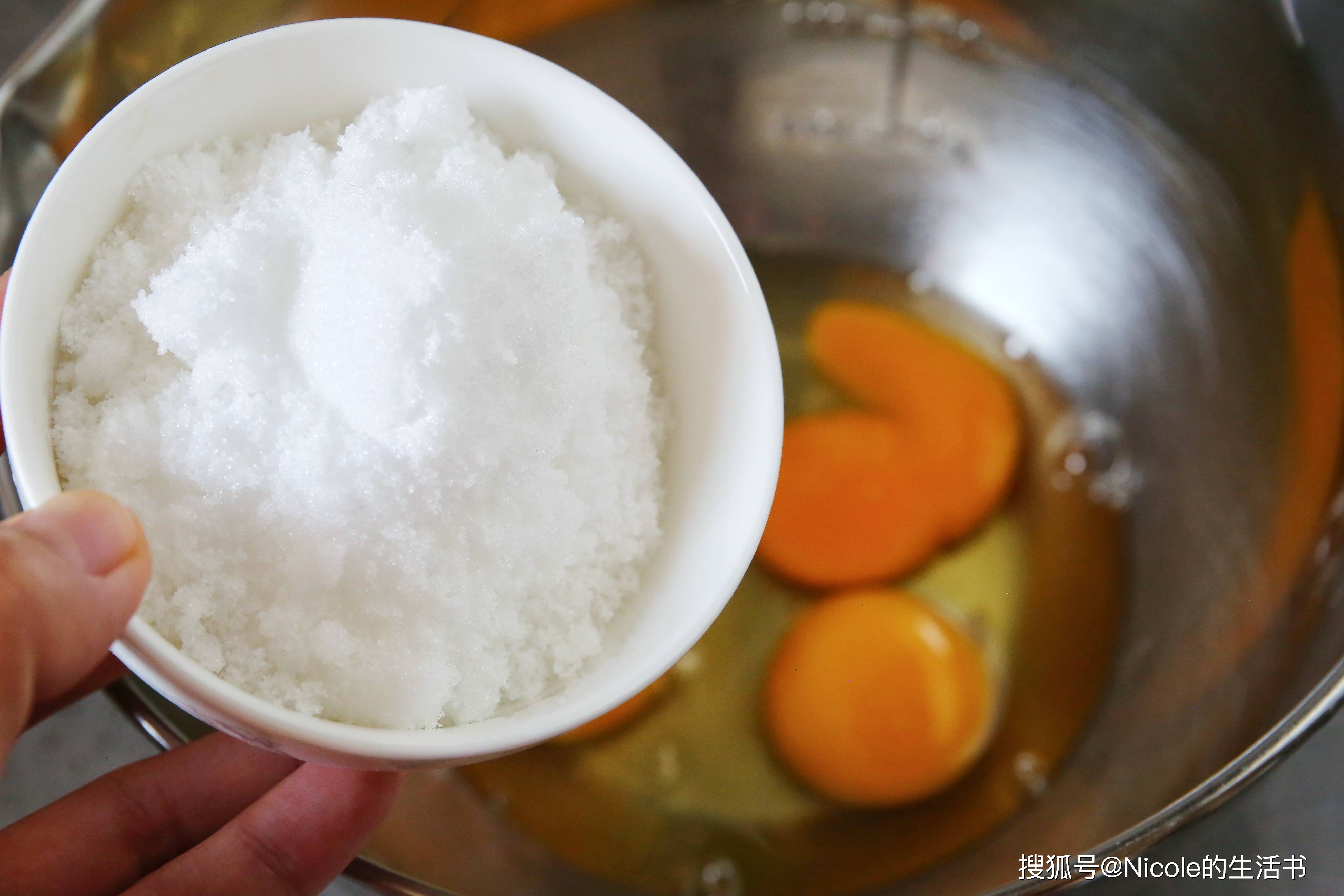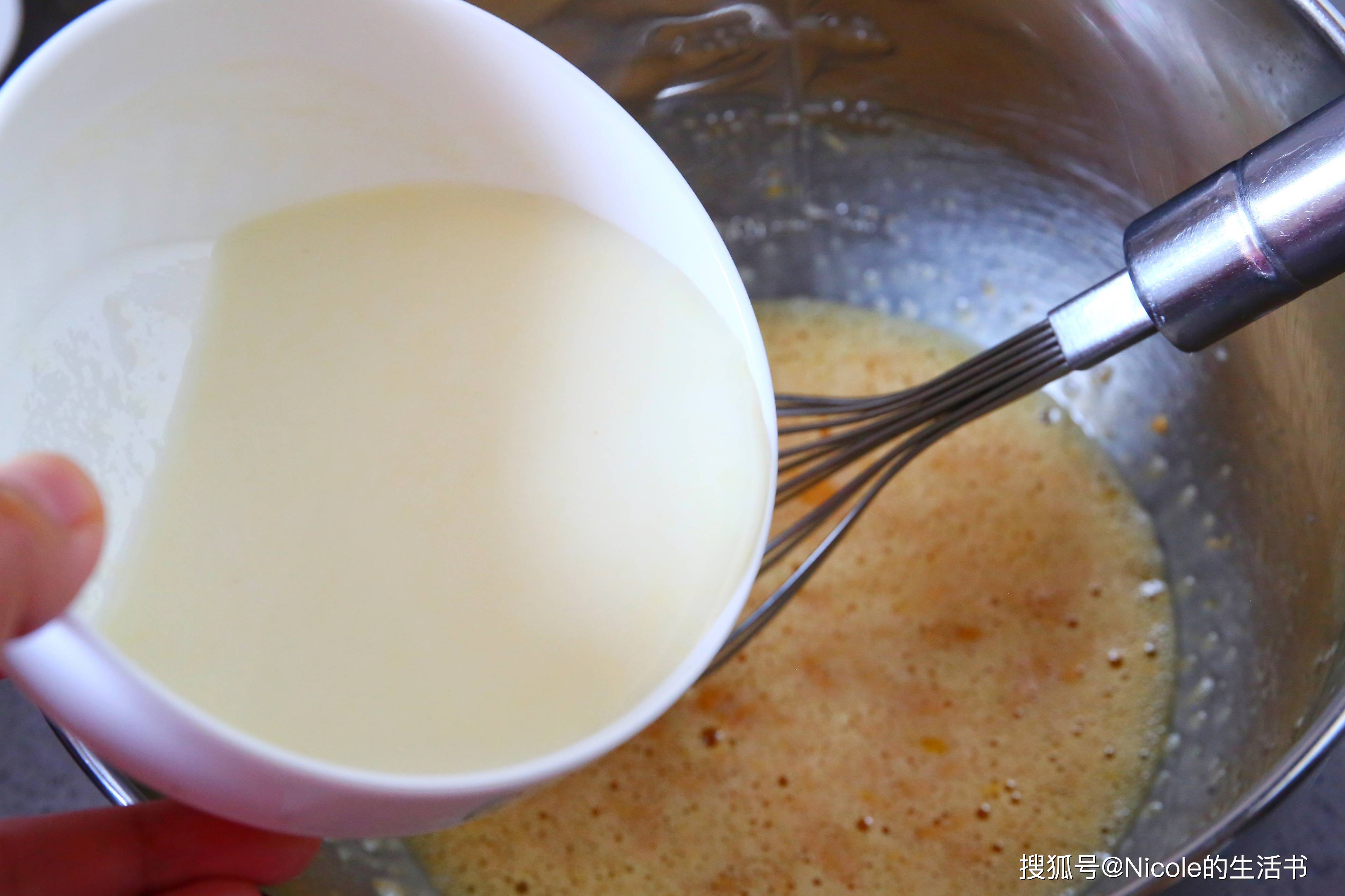 2. 糖的加入:加入绵白糖,使用打蛋器打至糖完全溶解。