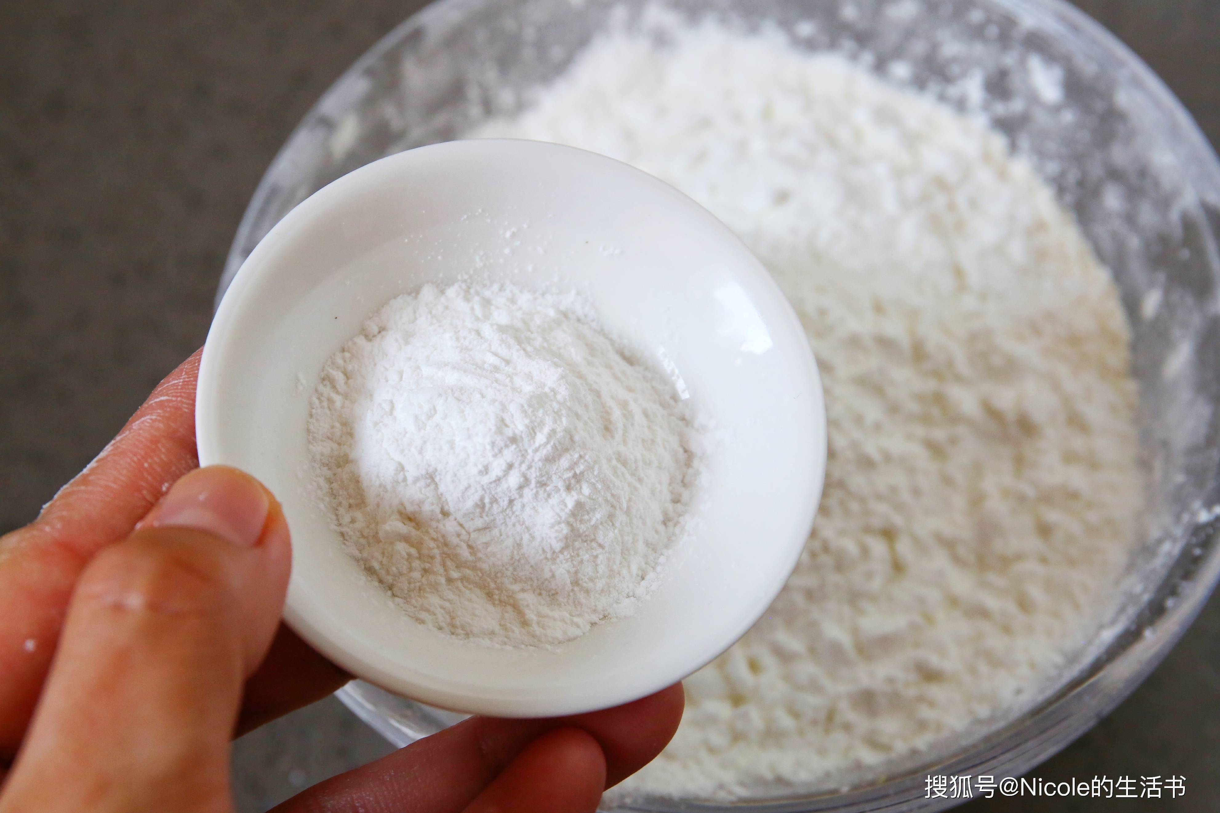 6. 泡打粉混合:再倒入泡打粉,混合均匀。