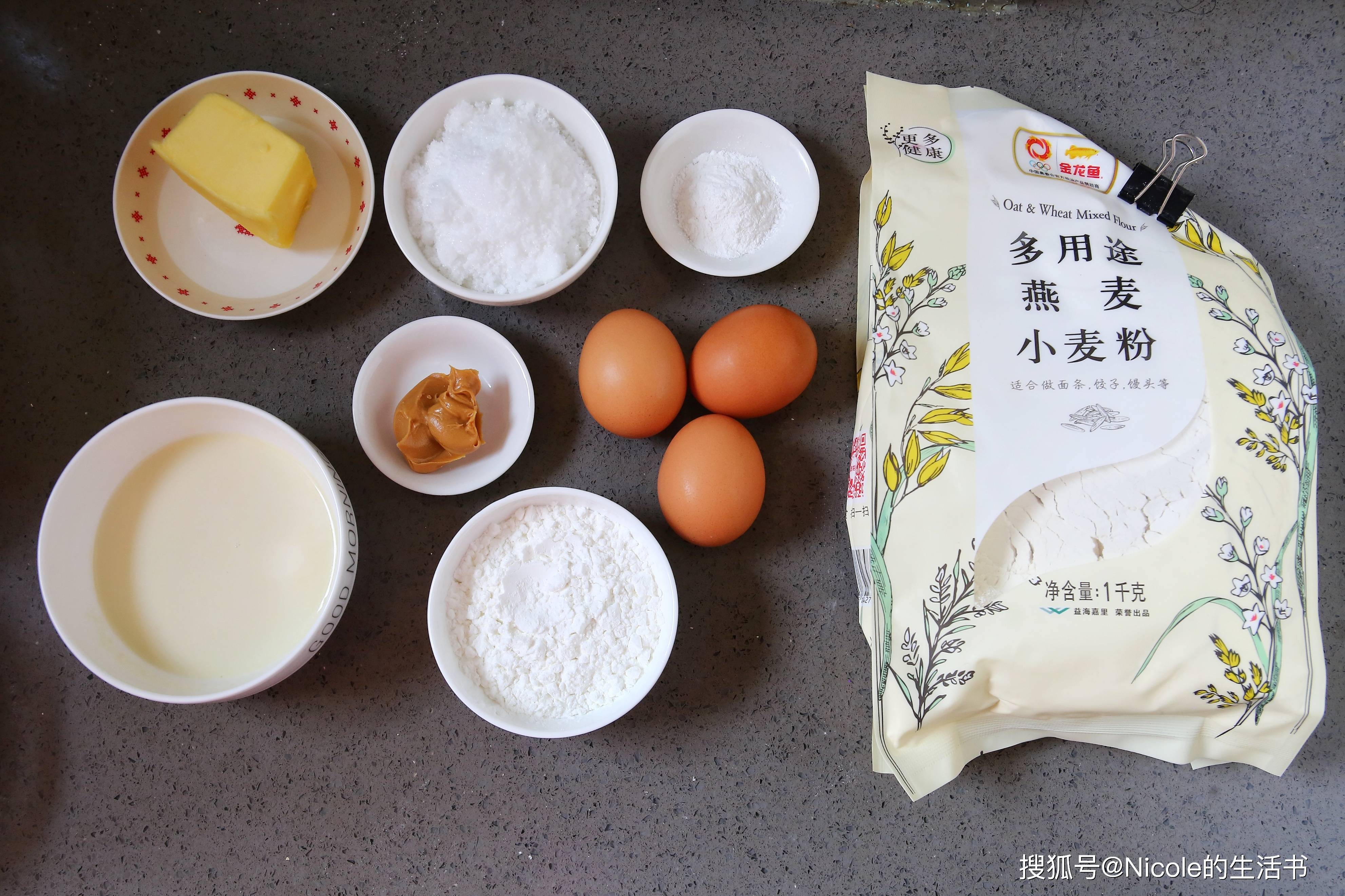燕麦小麦粉160g、牛奶100g、中型鸡蛋3个、花生酱15g、绵白糖65g、玉米淀粉40g、泡打粉6g、黄油60g