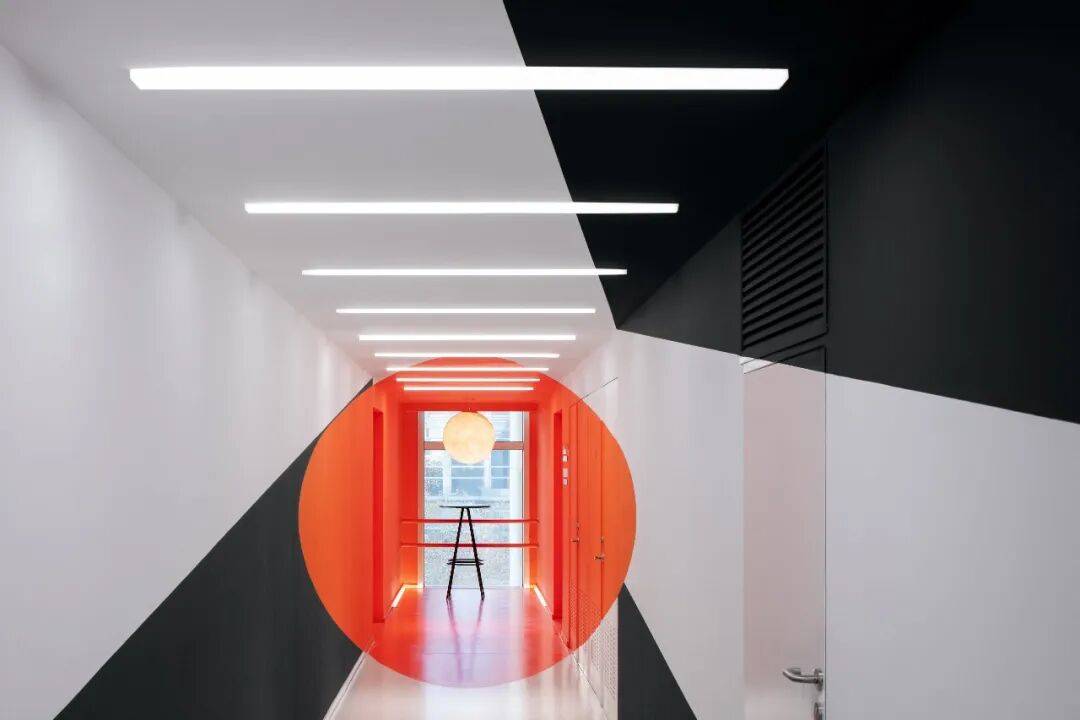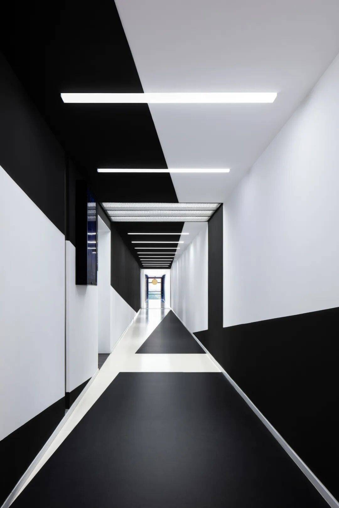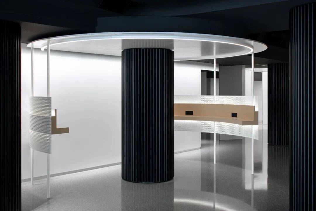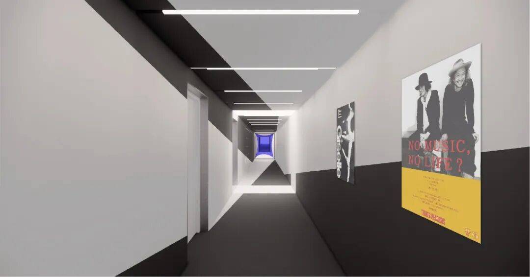 深灰通道 + 明亮展陈区,明暗对比,如 “剧院橱窗”;