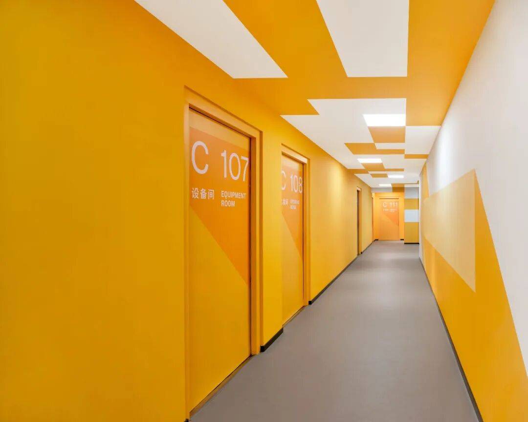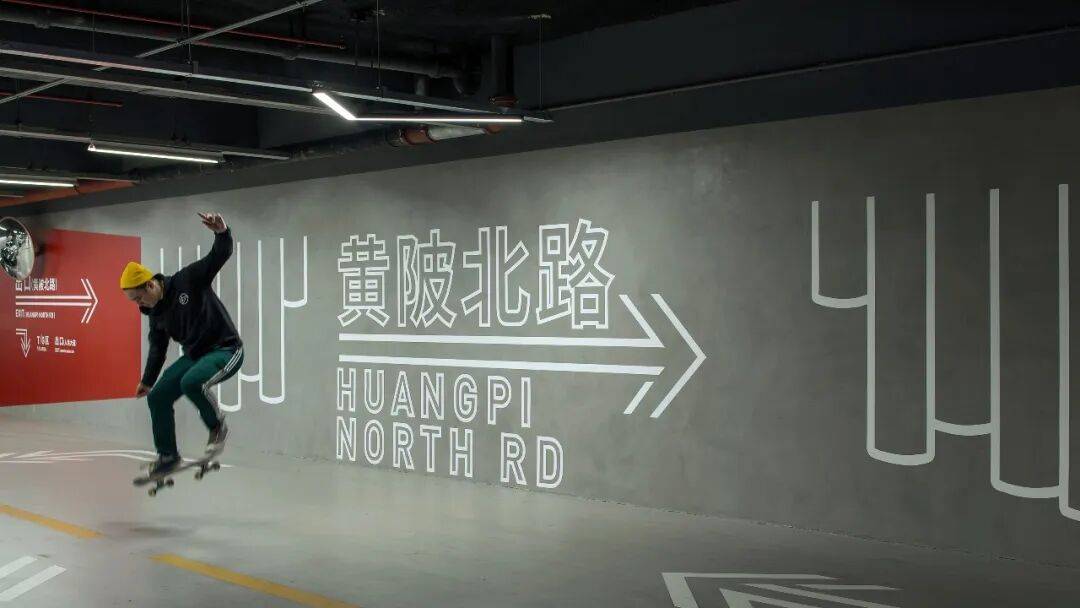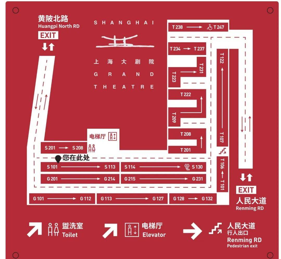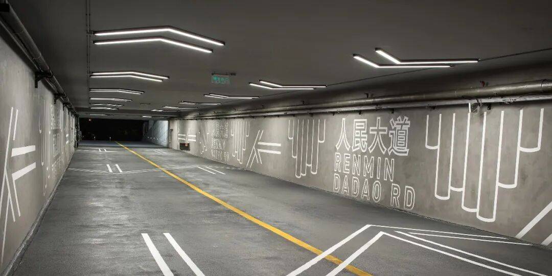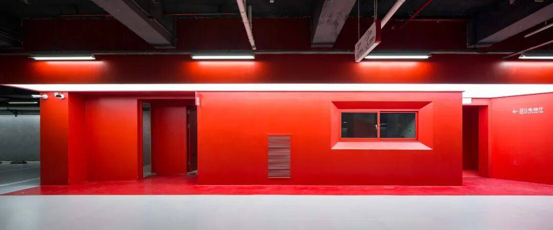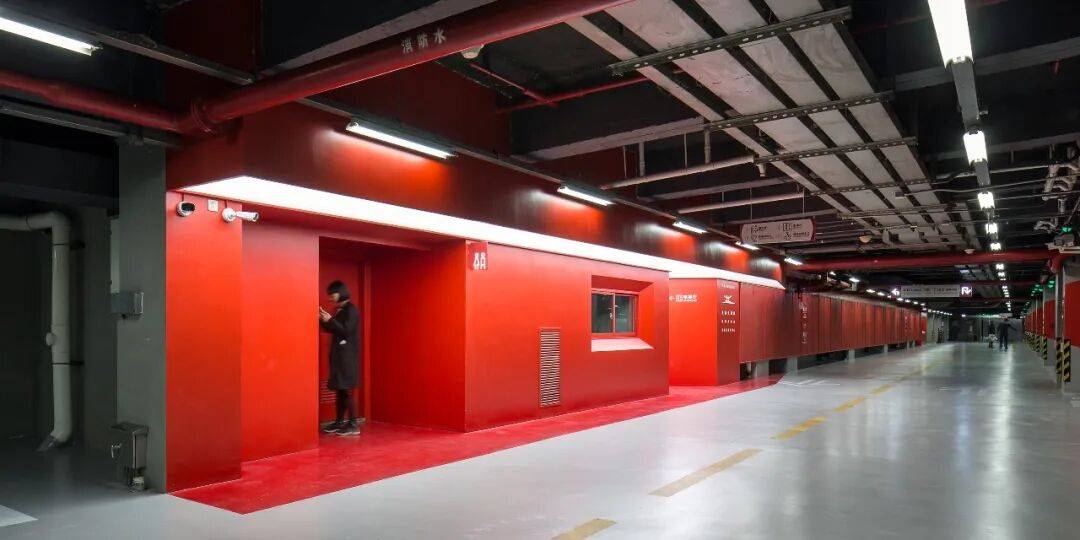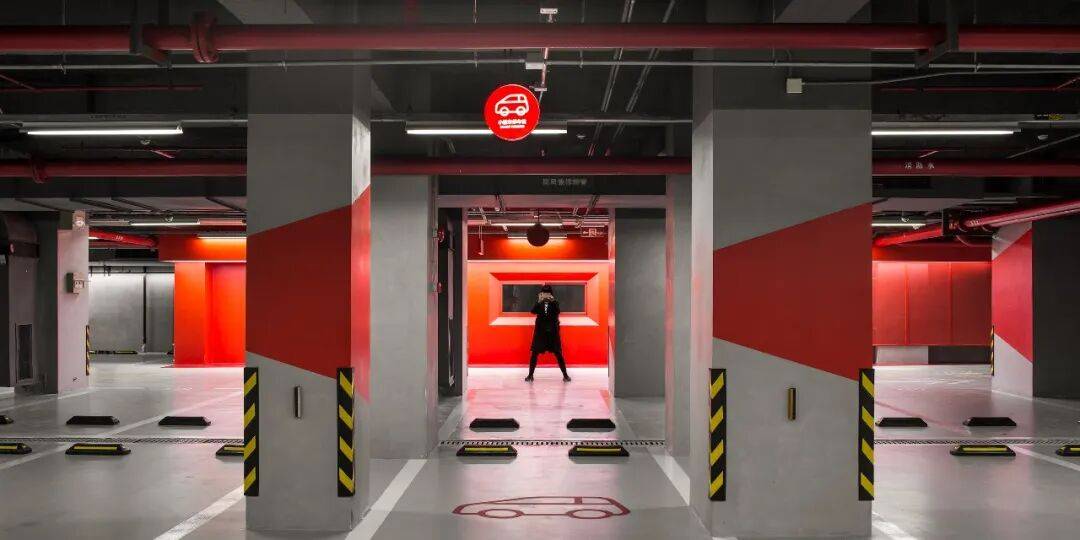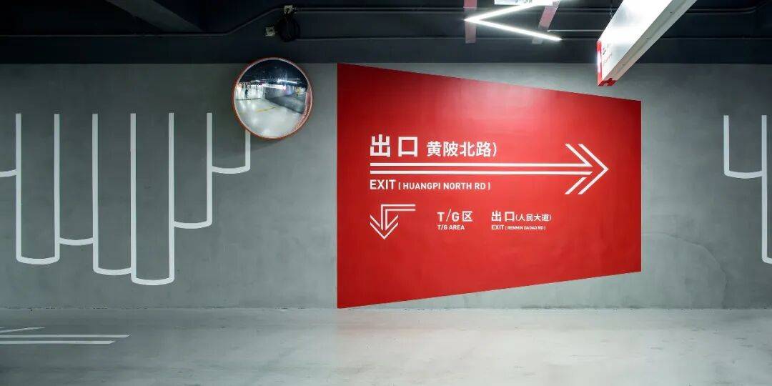 车库 / 连通道导视系统:红色主调 + 戏剧名人首字母分区,功能与文化结合;