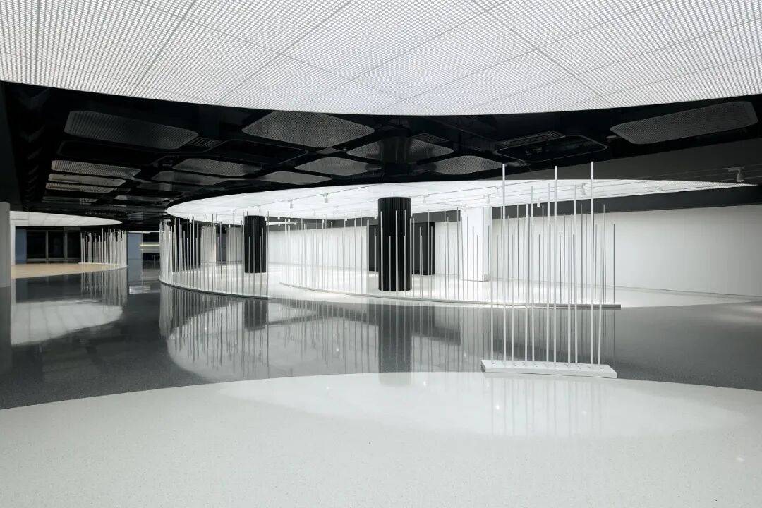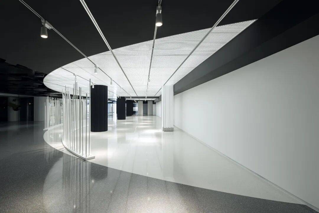重塑 20m 挑高大堂,弧形天花灯箱 + 弧形白色水磨石地面,形成强烈剧场感;