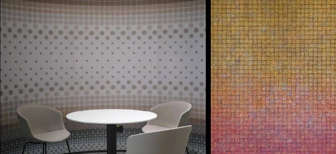 材质:木材、金属、天然石材打底;虹彩饰面随光影变幻;灰色编织 PVC 地板、拼接地毯、吸音吊顶柔化声响。
