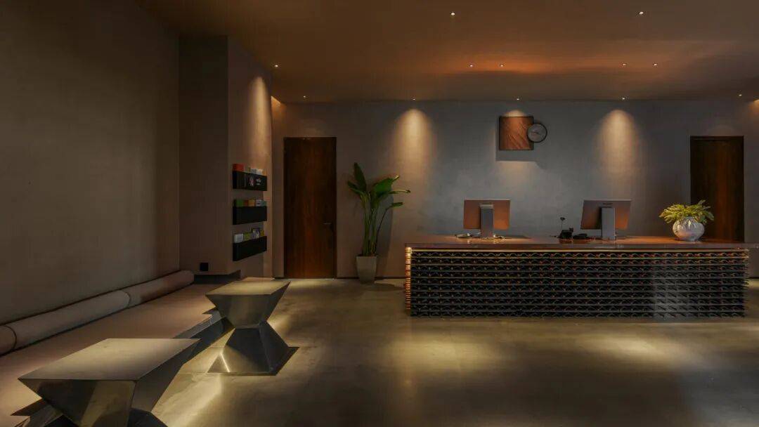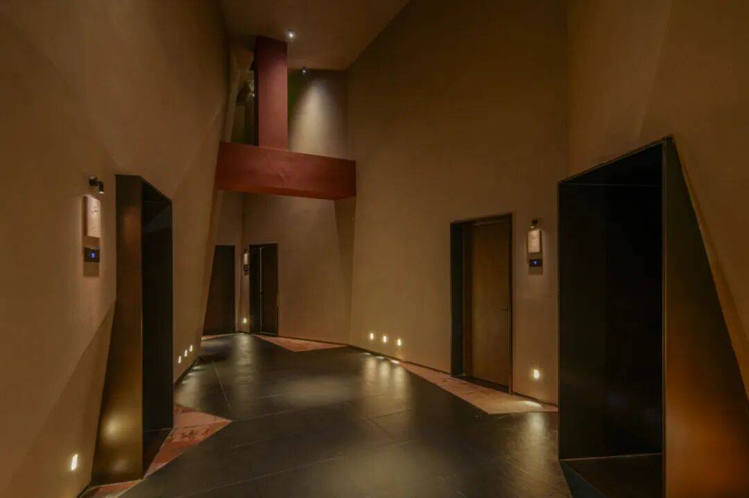 大堂:10 米挑高,延伸的中性软线性大理石图案为视觉焦点,连通内部中庭花园,强化 “无边界” 感。