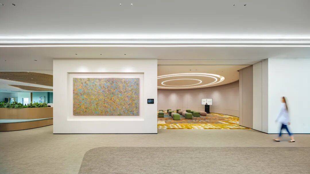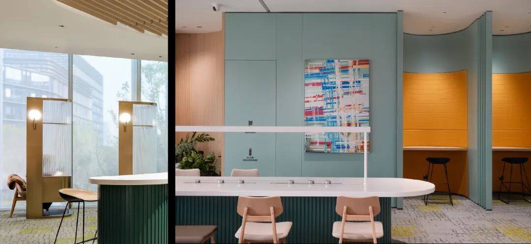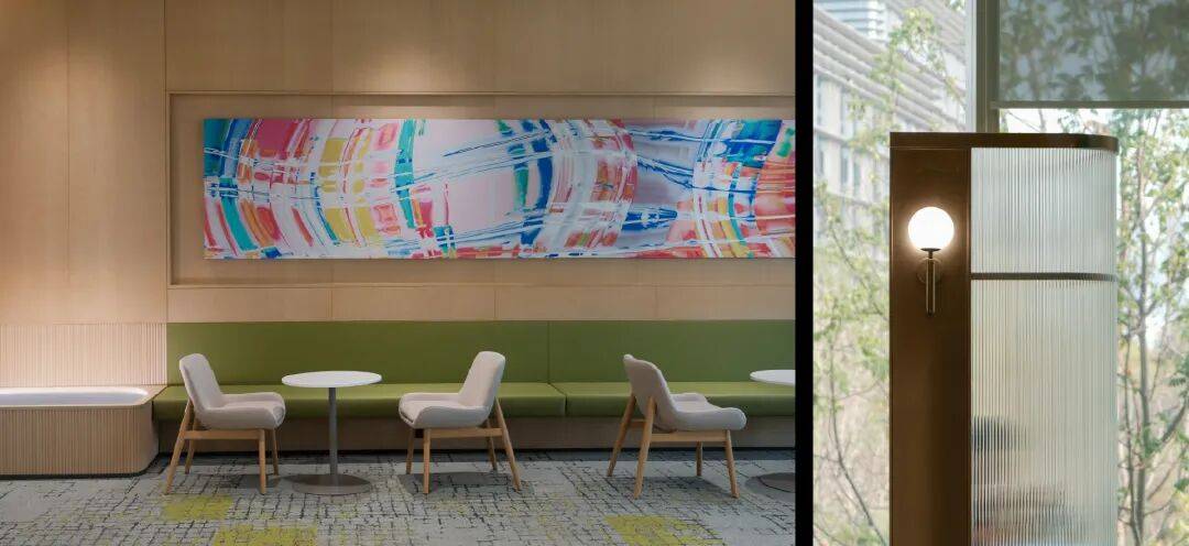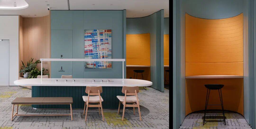 社交区在设计元素上与相邻的工作区一脉相承,氛围却更为轻松惬意。咖啡馆式的软包座椅,让人告别工作的紧绷姿态,不自觉地放松身心;座椅背后,色彩明快、线条大胆的抽象艺术作品,为空间注入韵律与视觉活力,进一步强化了社交场景的流动与随性。