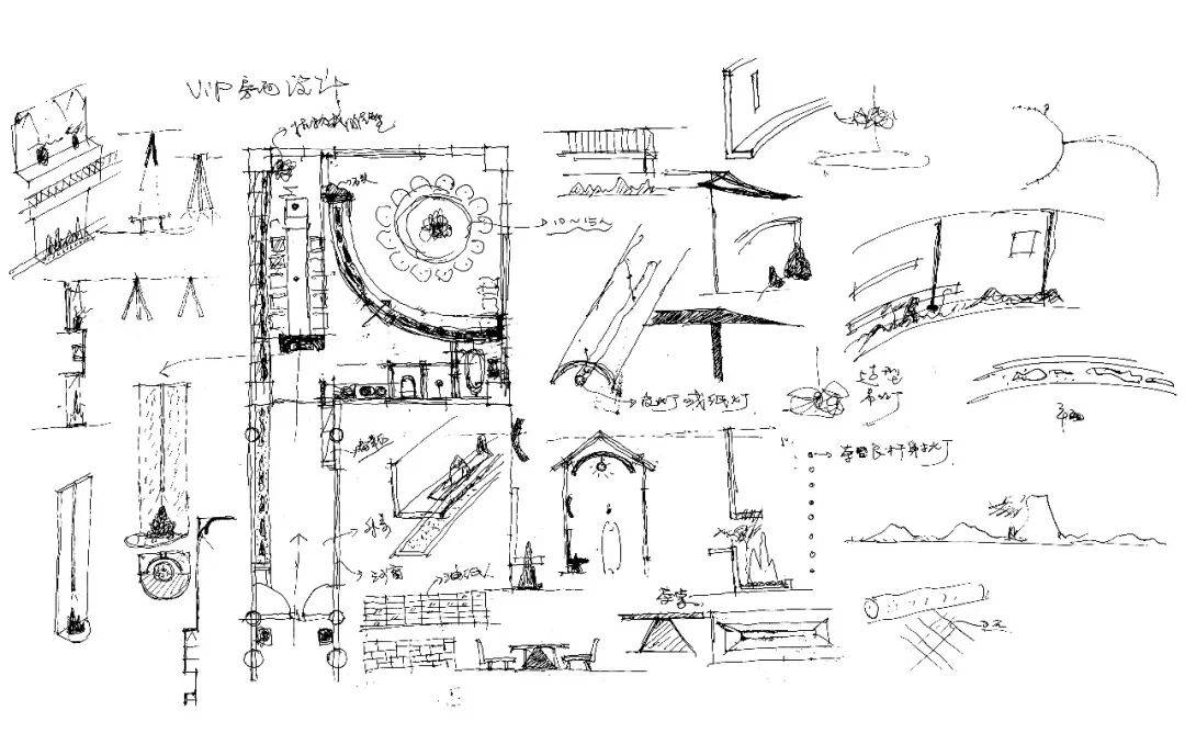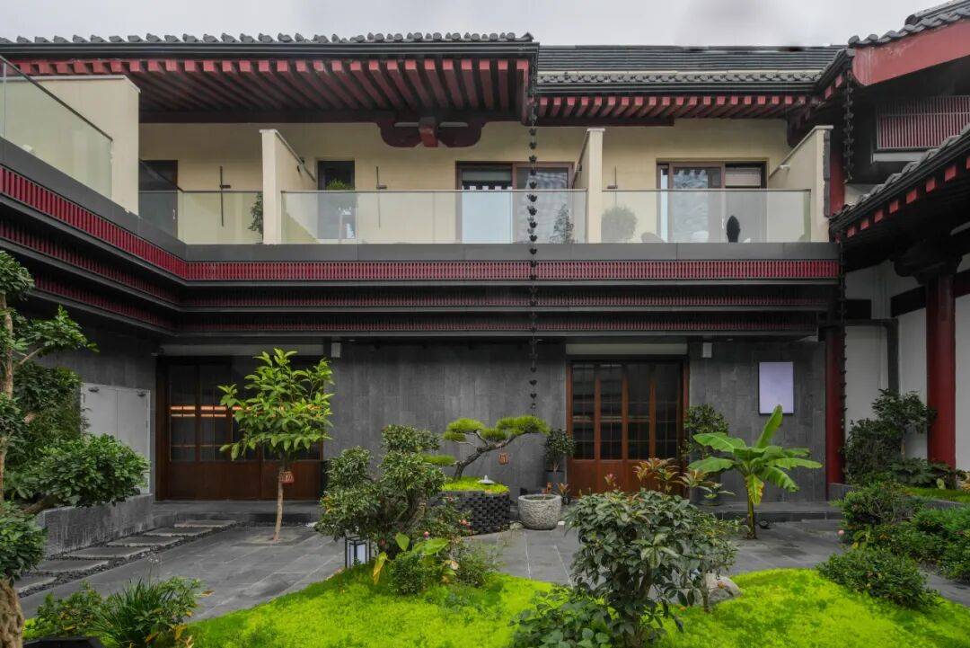 肌理:保留原混凝土仿古双坡屋顶与通高空间,用红墙、翠竹、古拙庭院弱化商业感,强化 “隐于市” 的静谧感。