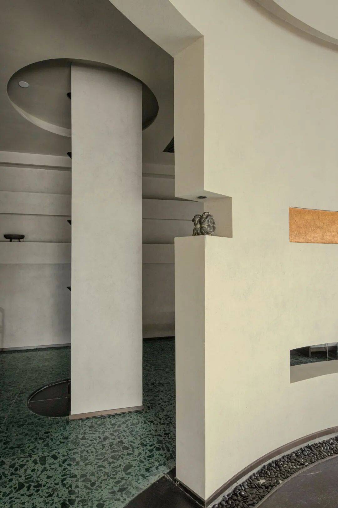 洞石与水磨石质感与颜色变化多且不张扬,多种配色方案为空间点睛,搭配素色软装与暗调房间形成统一又跳脱的空间性格。