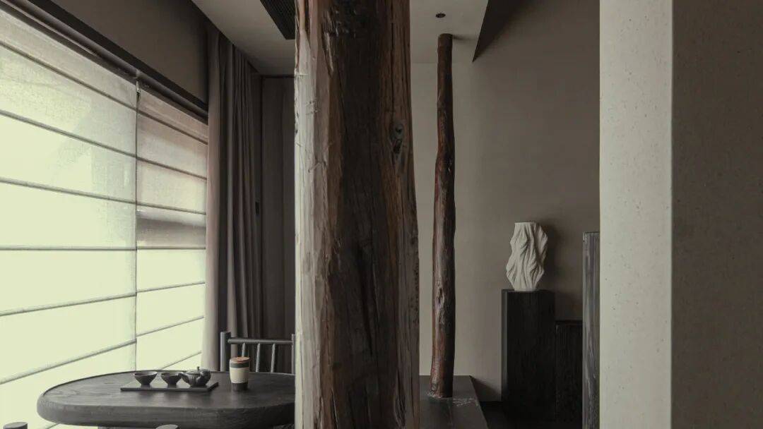 公区:挑高客厅融合极简新中式与侘寂美学,光影随时间流动。